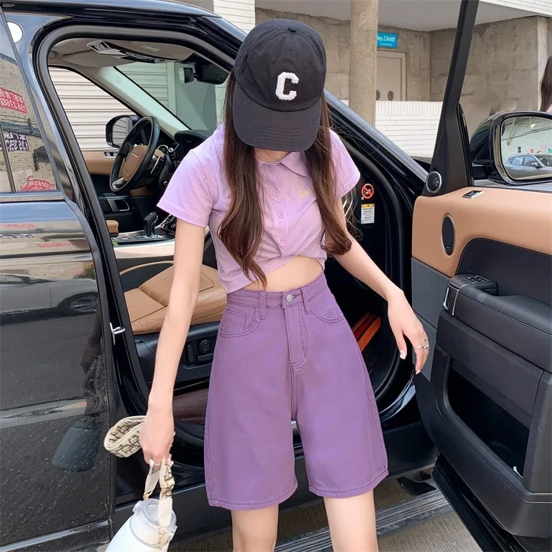 Summer Chic Straight Demin Shorts Loose Women Streetwear A-line Jeans Shorts High Waist Pockets Female Wide Leg Short Jeans