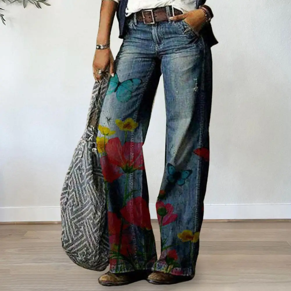 Women Pants Floral Print Button Zip Fly Straight Wide Leg Streetwear Spring Autumn Loose Faux Jeans Trousers For Daily Wear