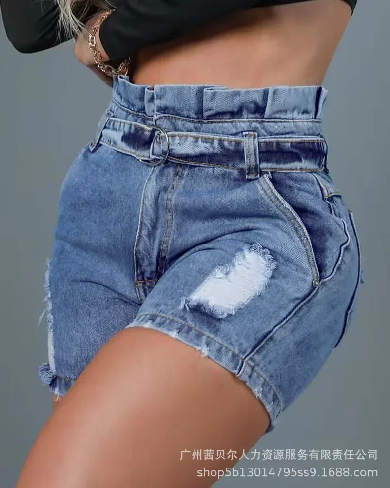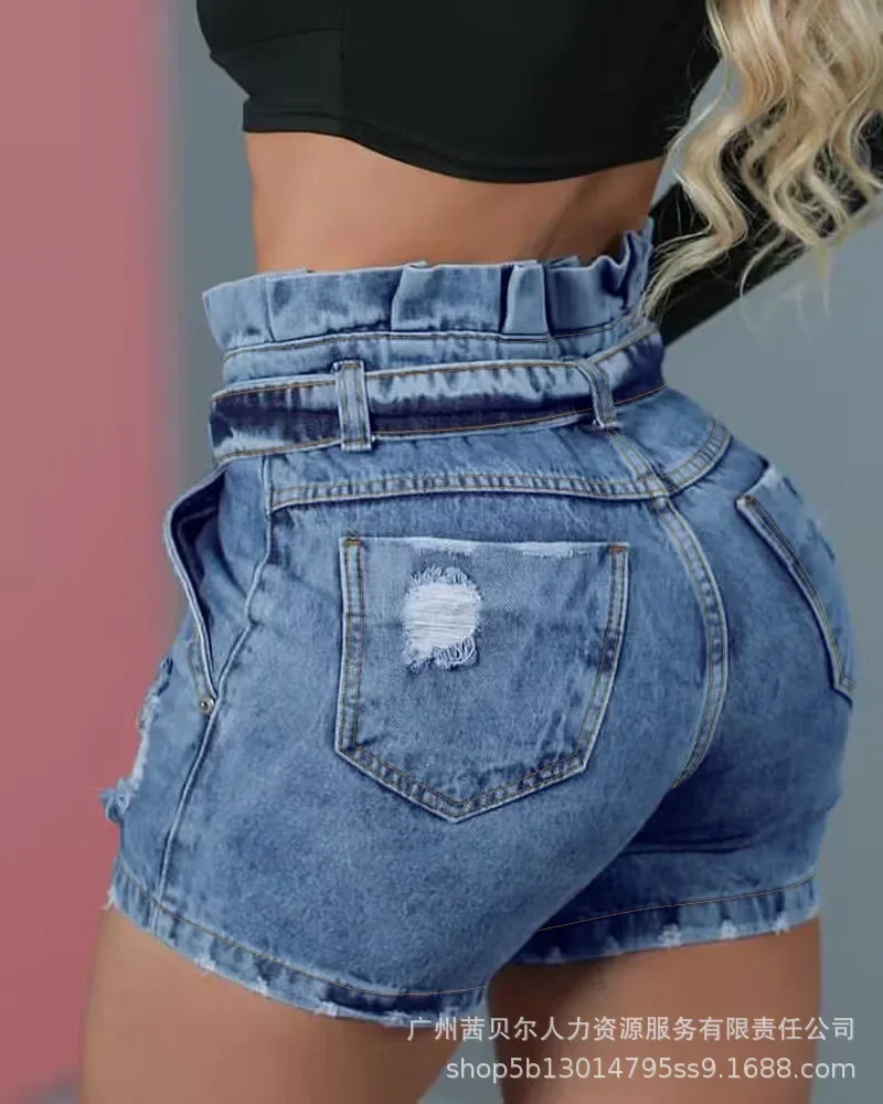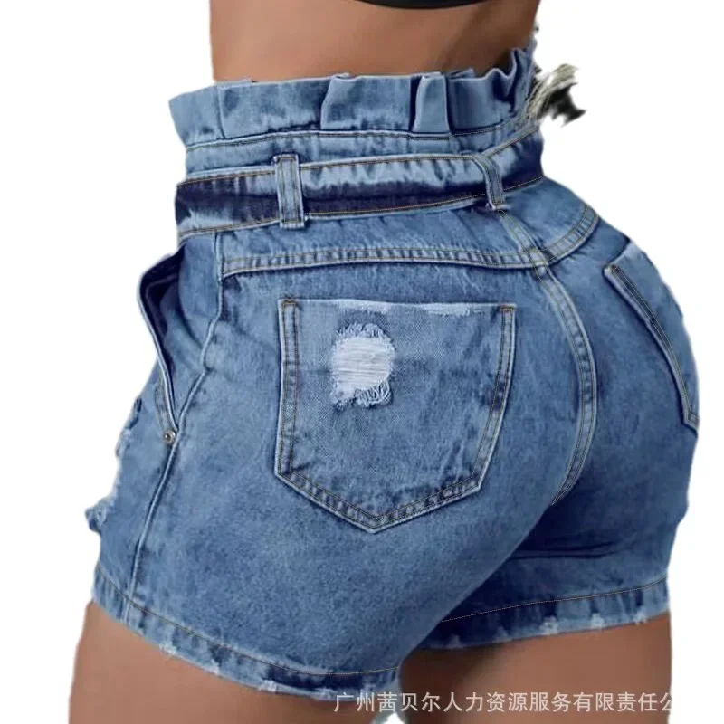 2023 Womens Jeans Ruffled Stitching Strap Hole Tight Denim Shorts for Women