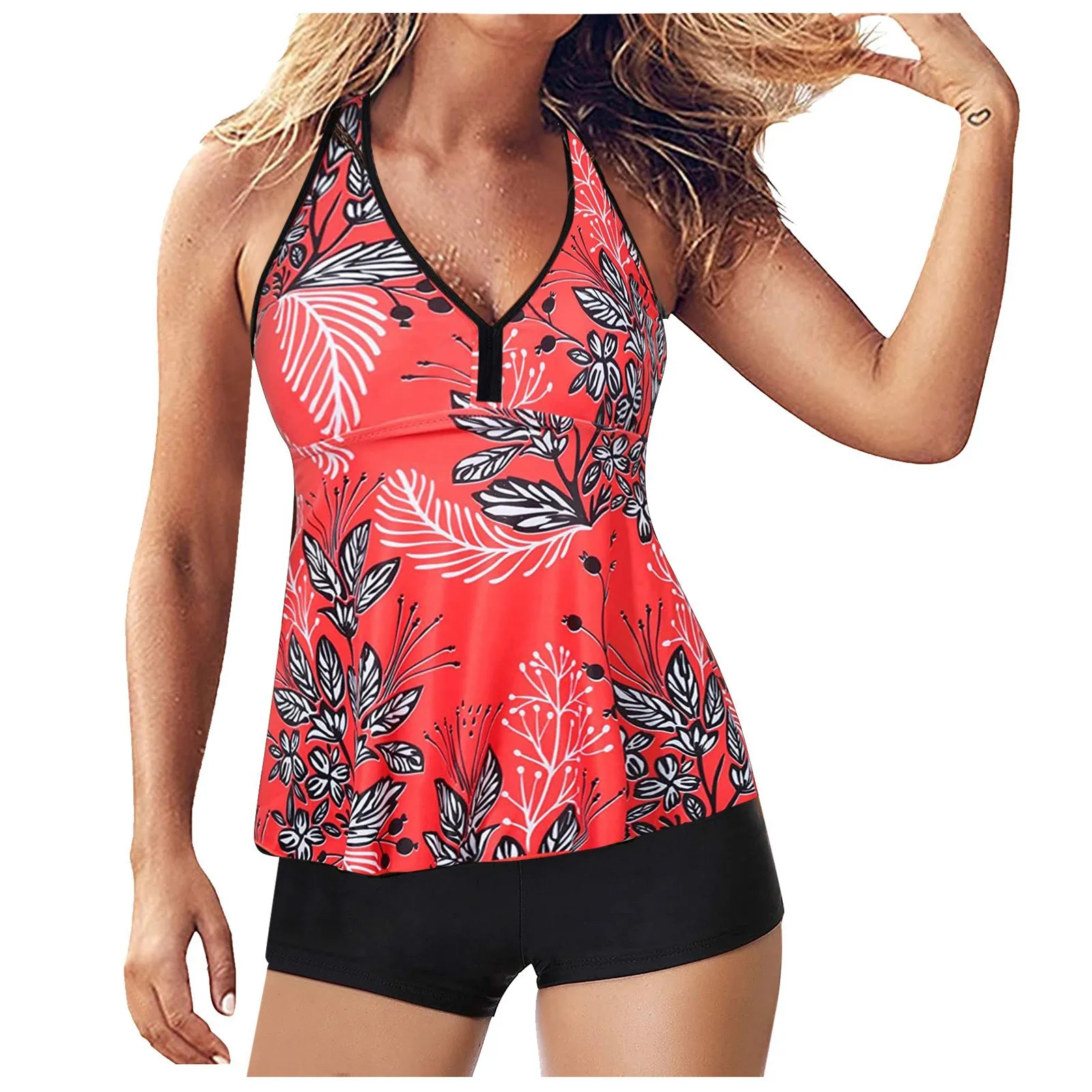 2 Pieces Swimsuit V Neck Tummy Control Suit Solid Women Top Shorts Beach Swimwears Tankinis Set 2023 Summer Bathing Suits