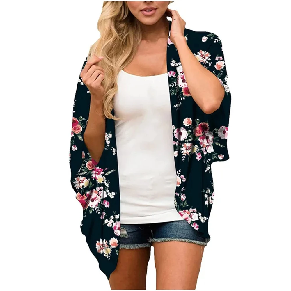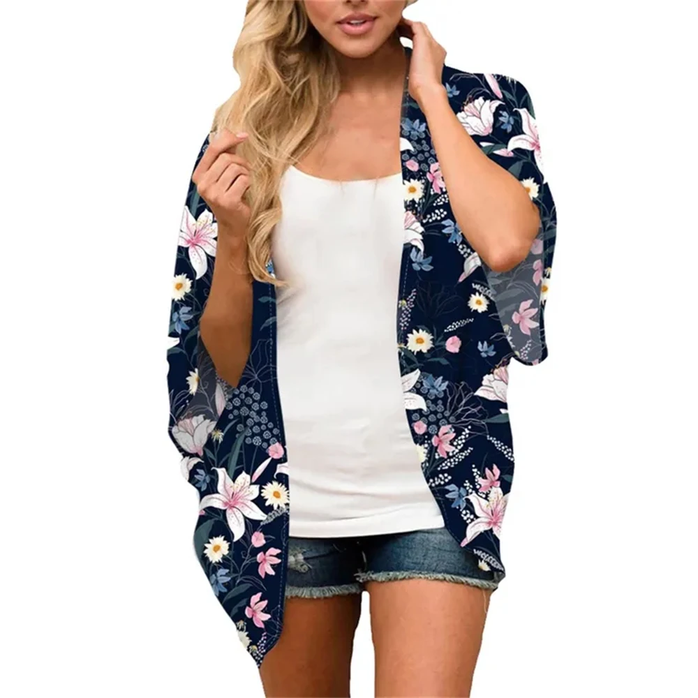 2024 Cardigans Women Beach Tops Fashion Middle Sleeve Printed Chiffon Loose Easy Coats Large Size Thin Coats Beach Cover Ups