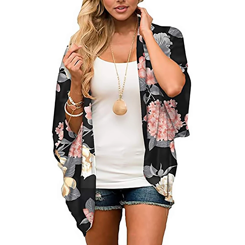 Women'S Chiffon Cardigan Tops Summer Casual Kimono Shirts With Floral Pattern Shirt Sleeve Front Split Loose Fit Blouses Coat