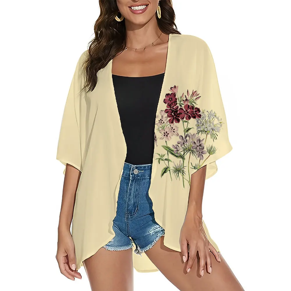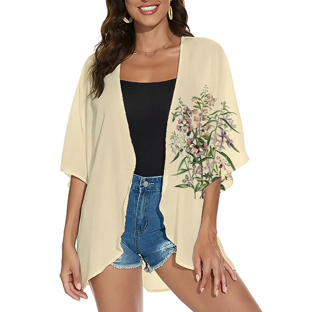 2024 Fashion Women's Floral Print Kimono Cardigan Puff Sleeve Cover Up Top Half Sleeve Shirt Sexy Bikini Swimsuit Kimono Coat