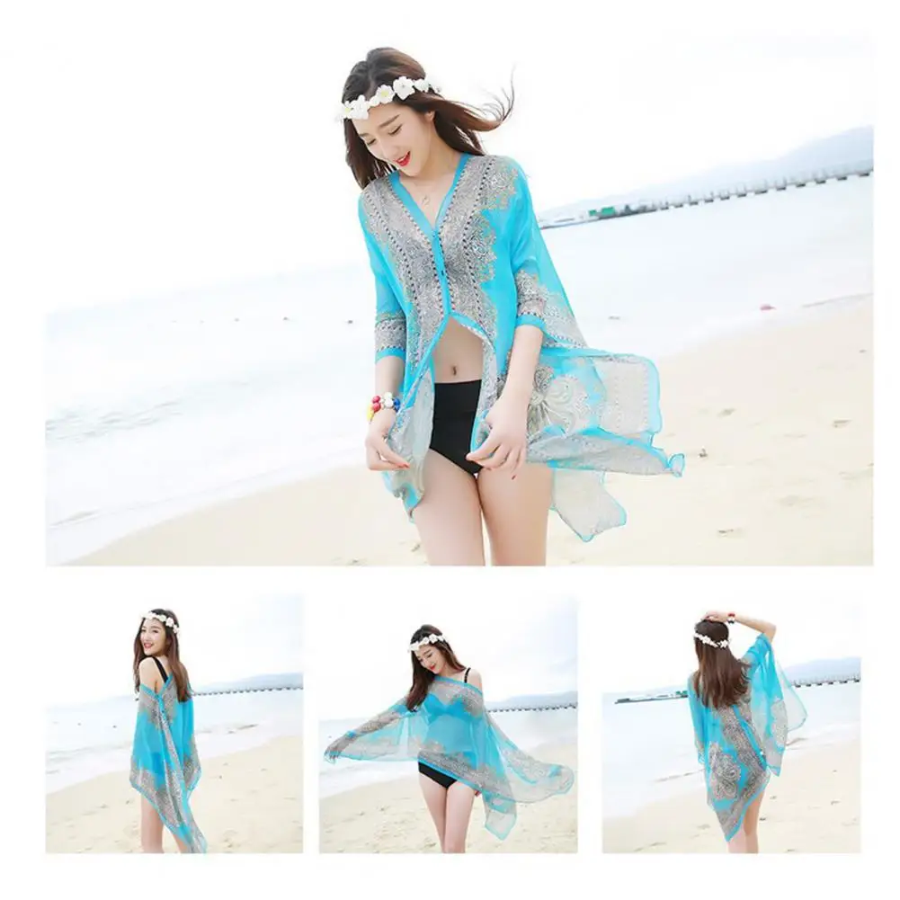 Women Scarf Poncho Cashew Flower Print Chiffon Vintage Anti-sun Bikini Cover Up for Beach Swimwear Women Bikinis Swimsuit