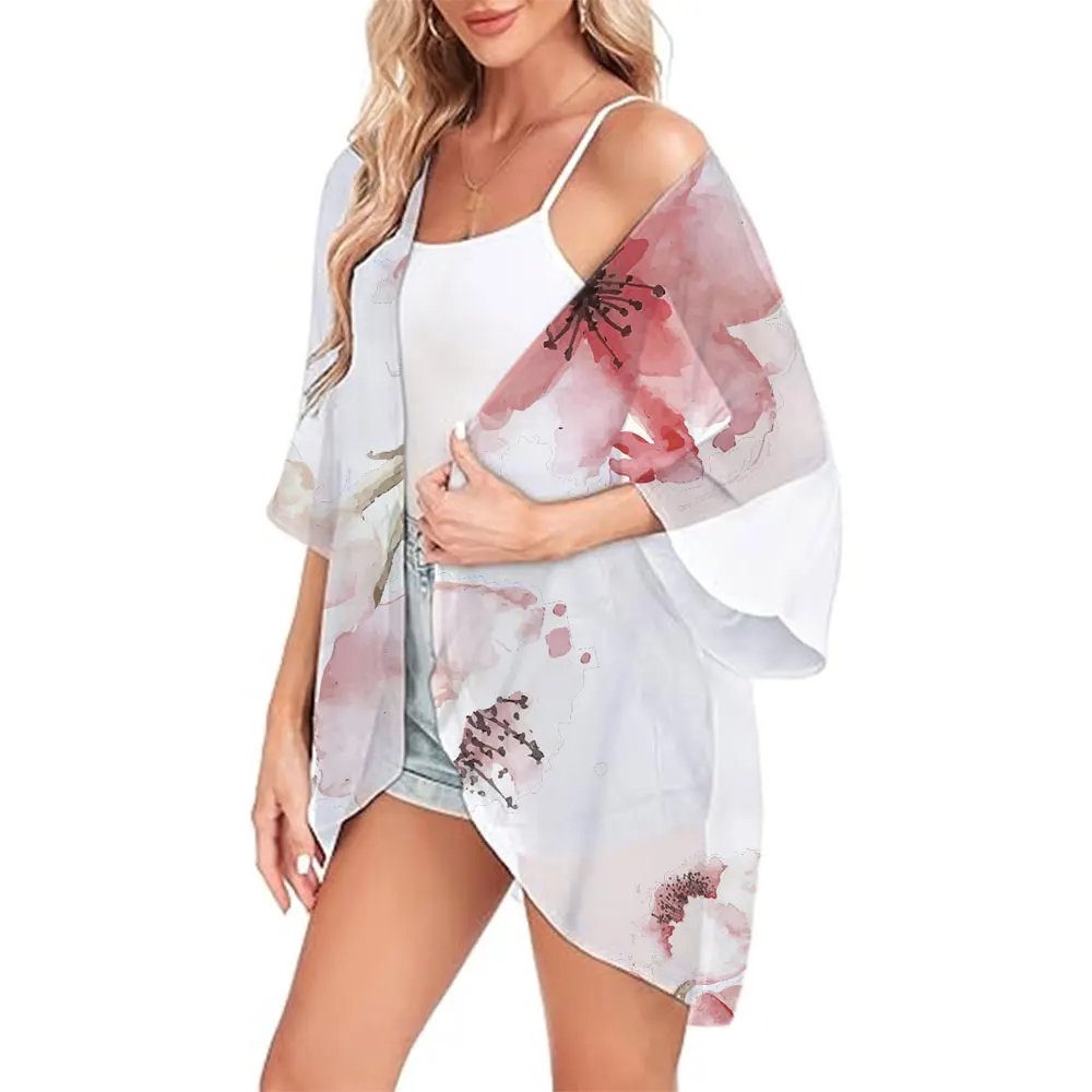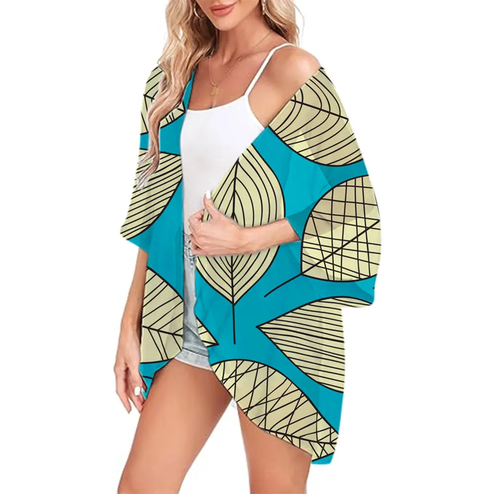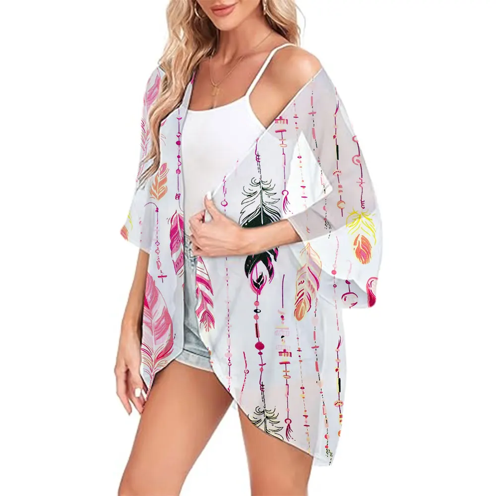Boho Vintage Feather Print Tops Bohemian Chiffon Cover-ups Beach Summer Short Kimono Women Fashion Ladies Casual Swimsuit Coat