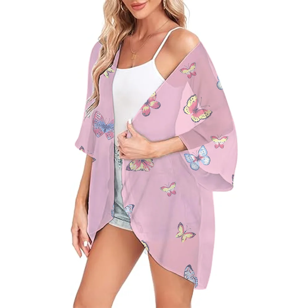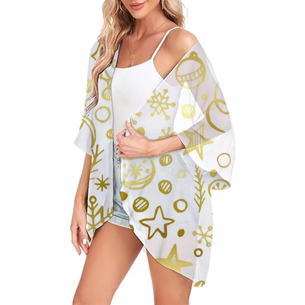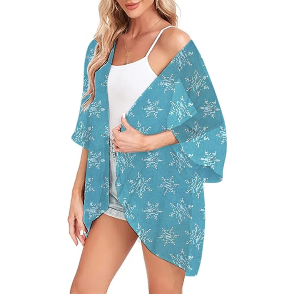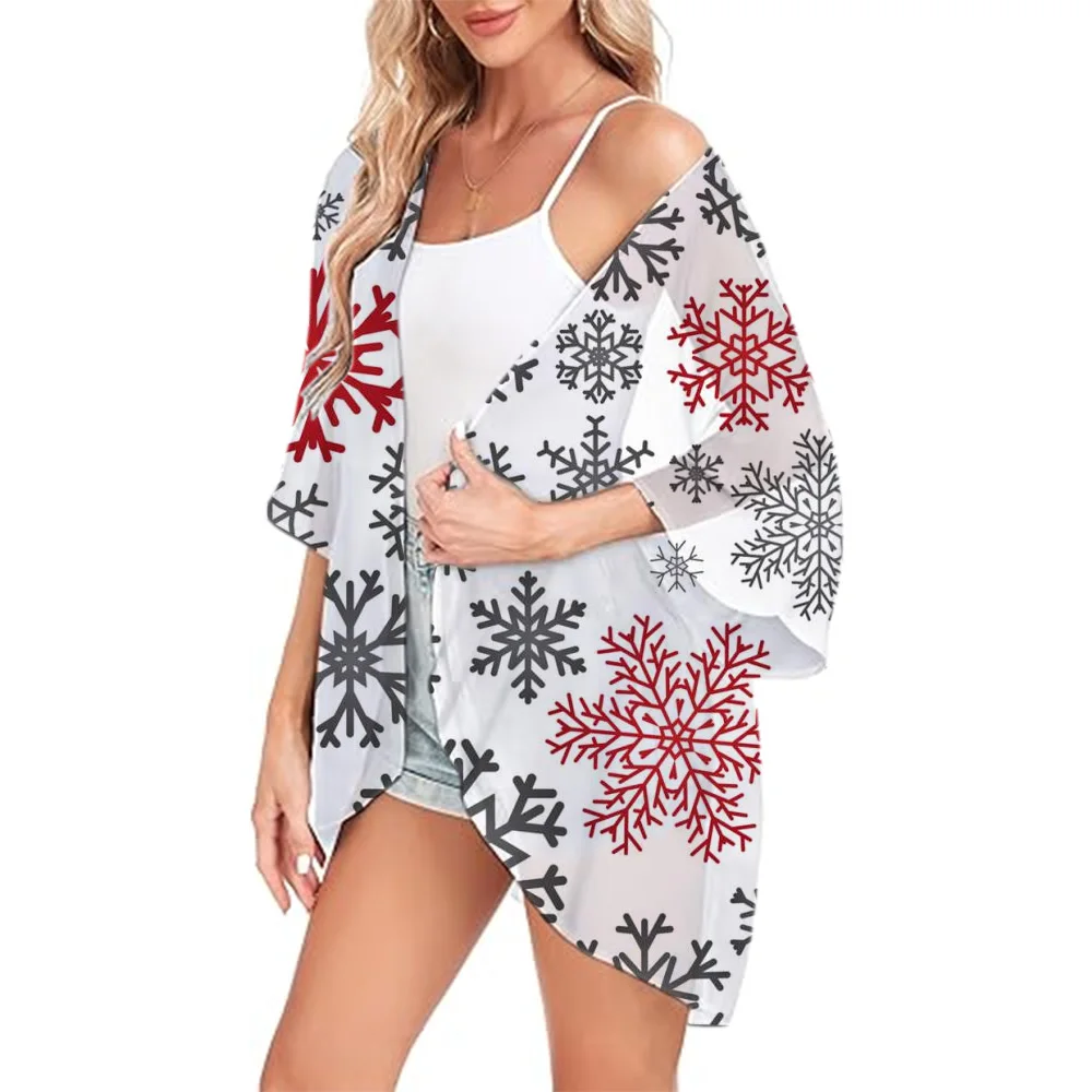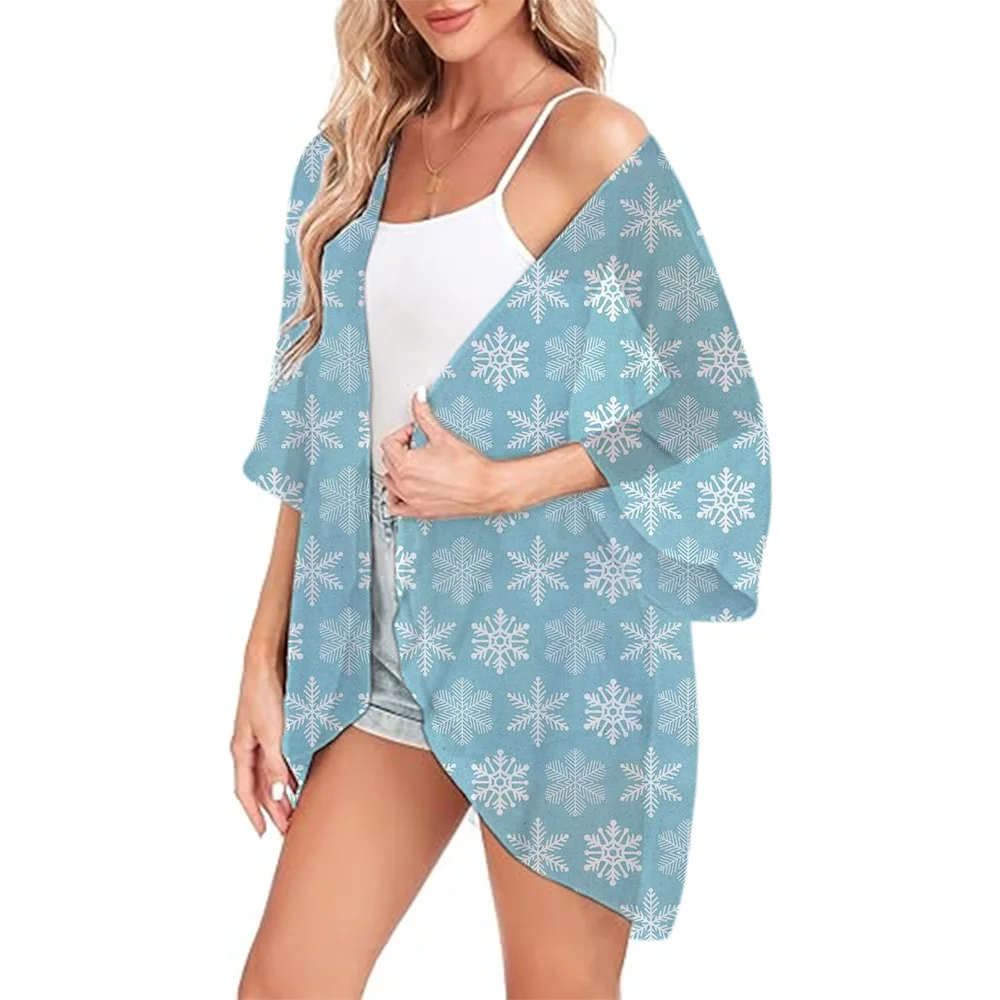 Women's Beach Chiffon Cover Up Swimsuit Kimono with Snowflake Printed Loose Casual Resort Wear Summer Cardigan Tops Shirts S-3XL