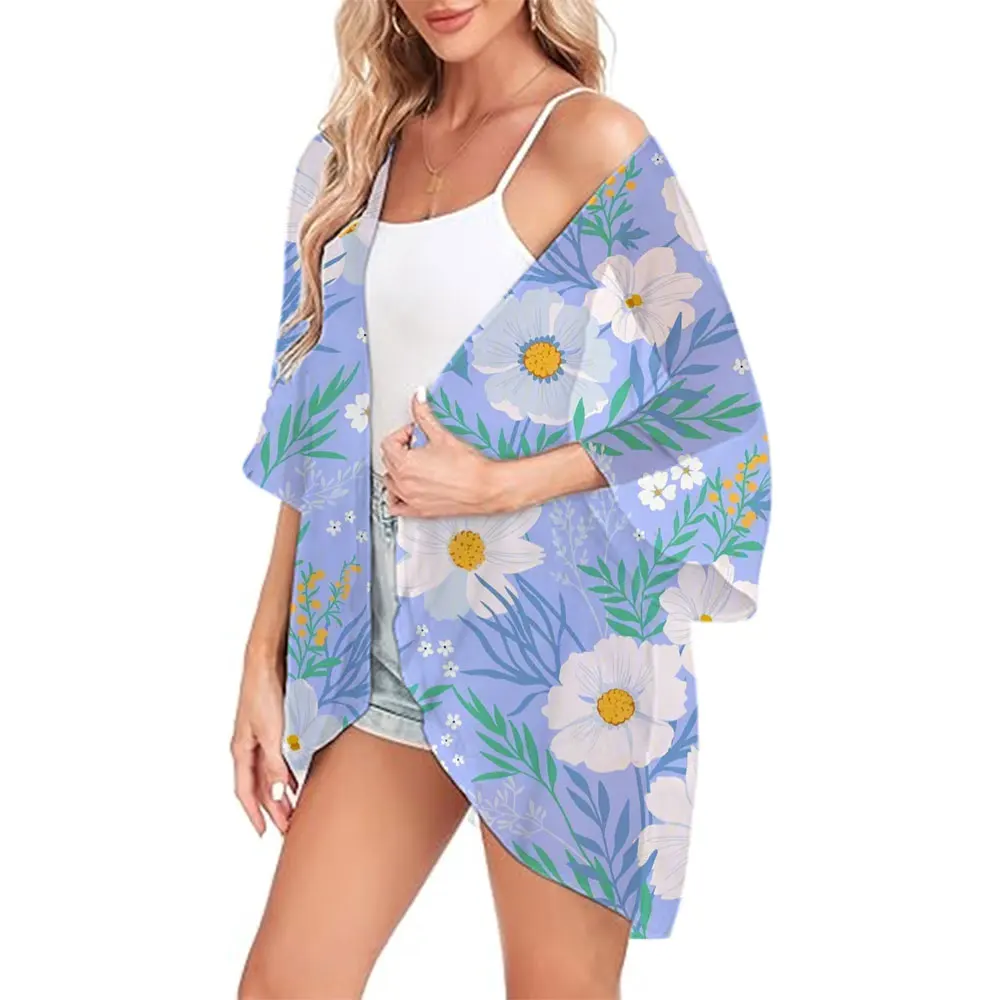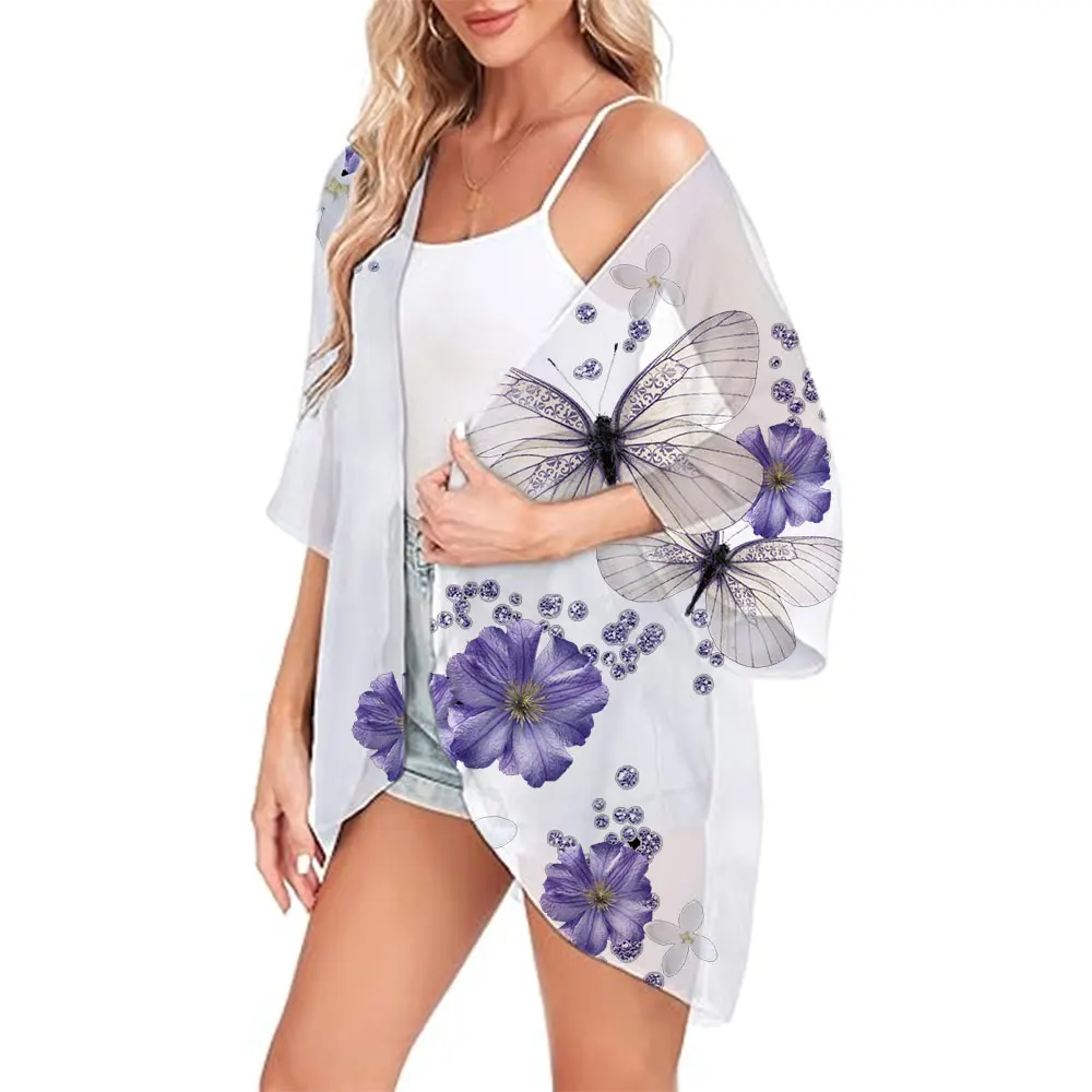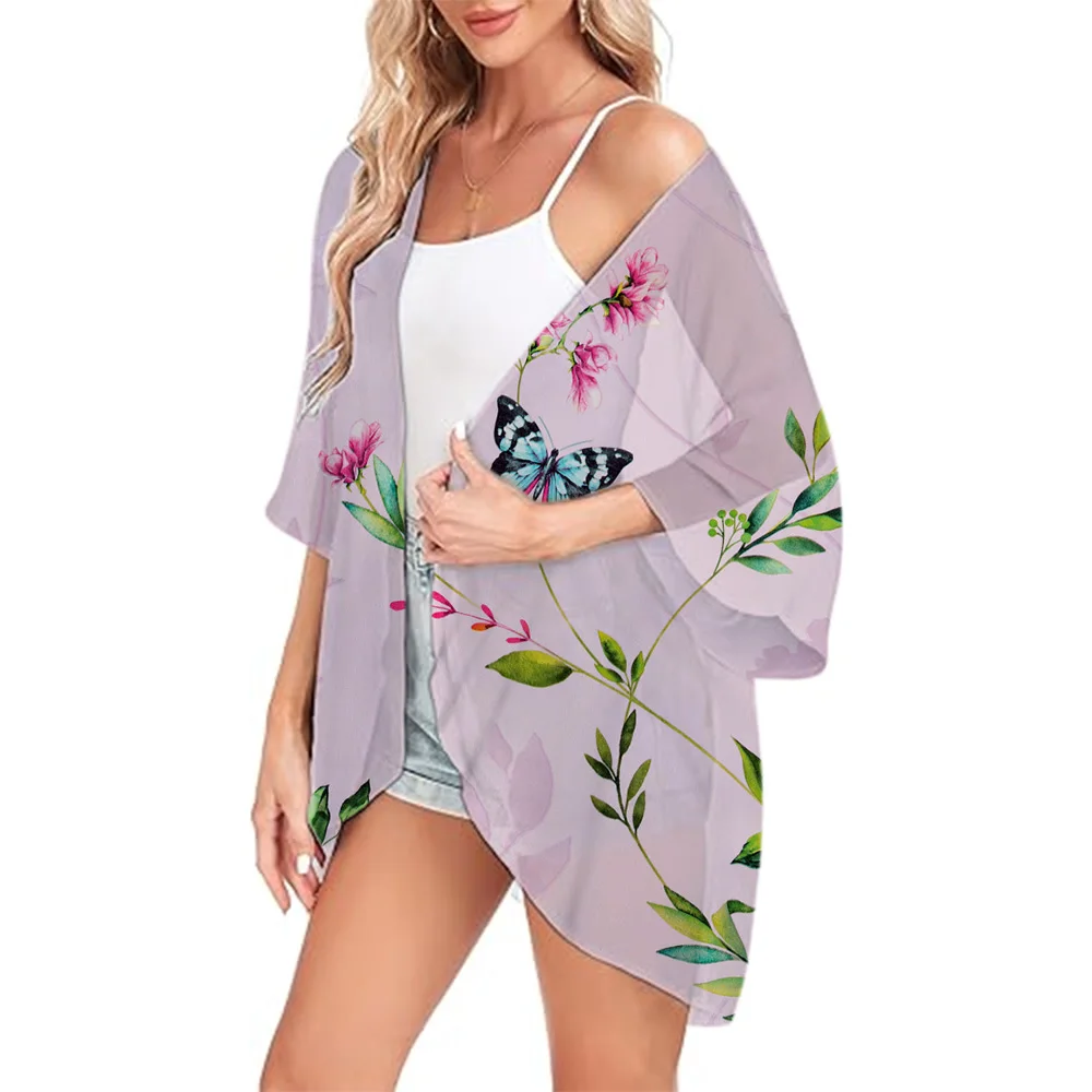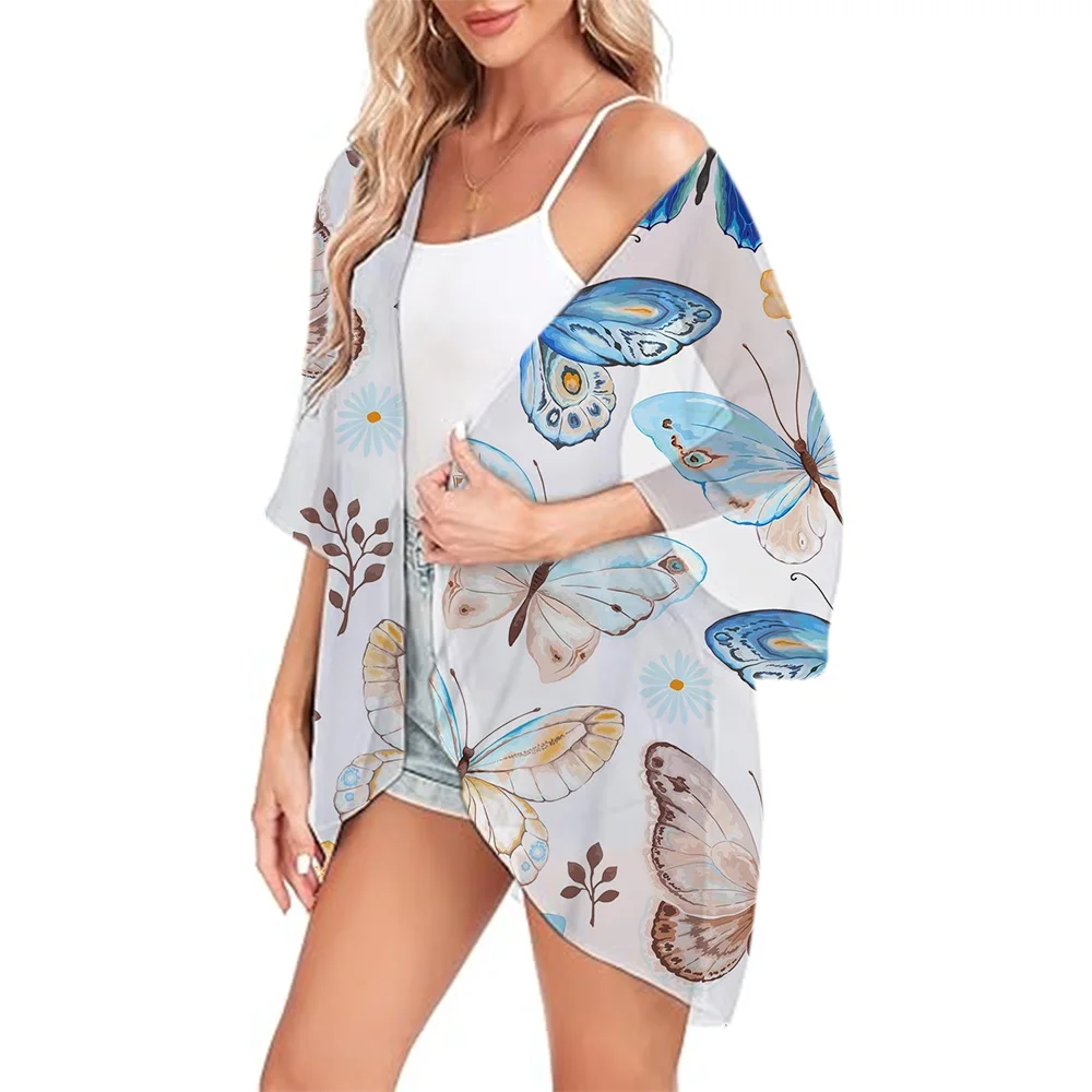 Fashion Chiffon Cover-ups Butterfly Printed Summer Open Front Kimono Ladies Swimwear Breathable Swimsuit Women's Cardigan Tops