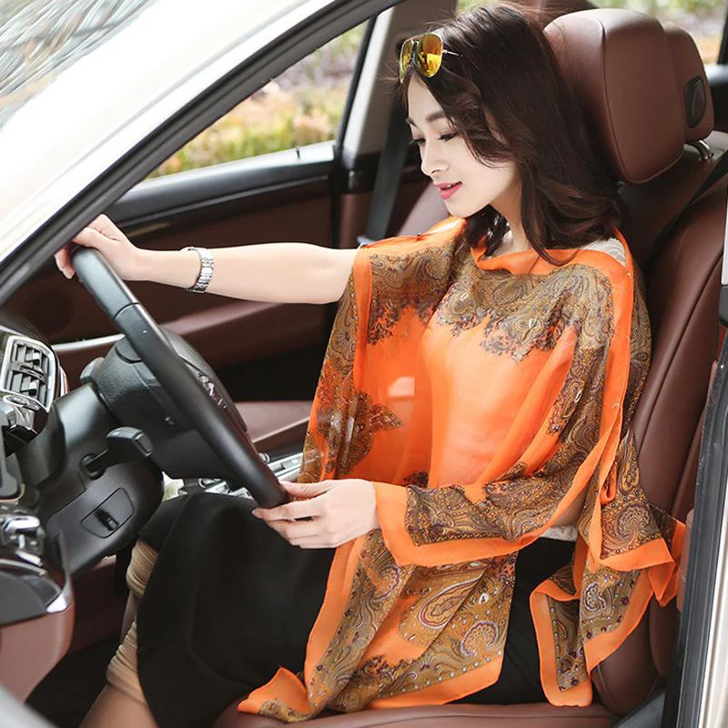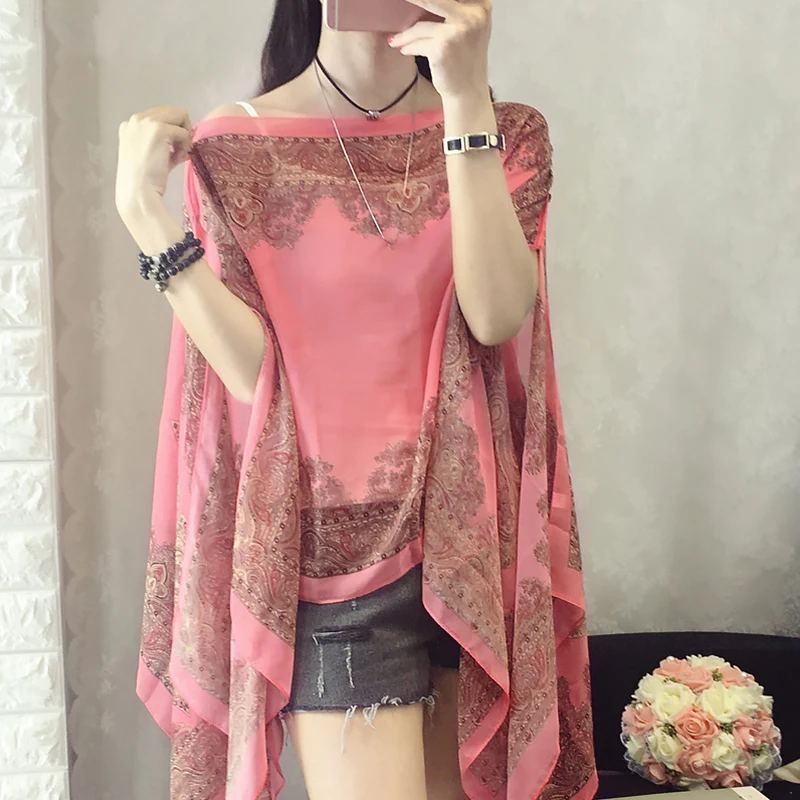 Fashion Casual Sunscreen Scarf Floral Printed Chiffon Bikini Cover Up Plus Size Shawl Women Summer Beach UV Protection Tops