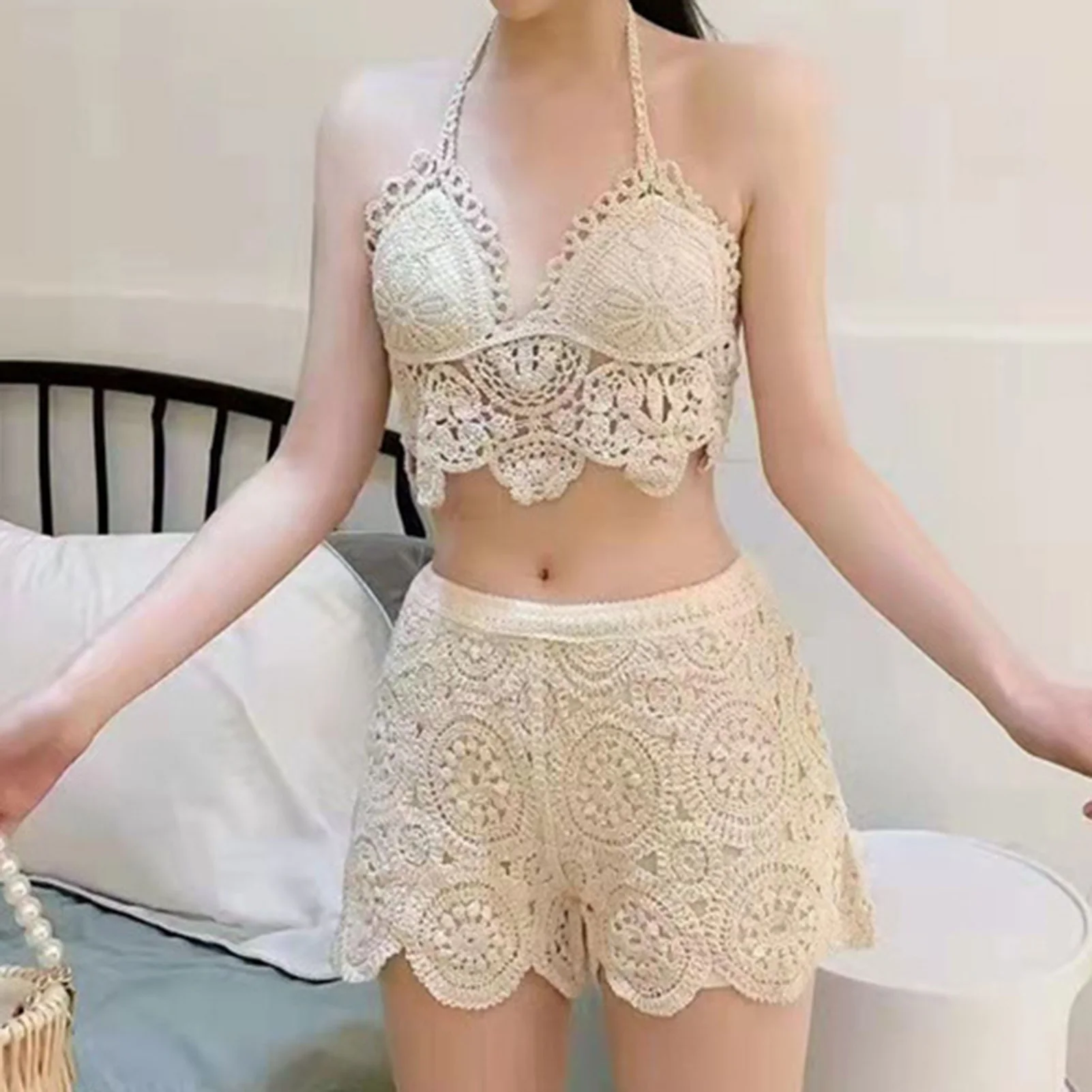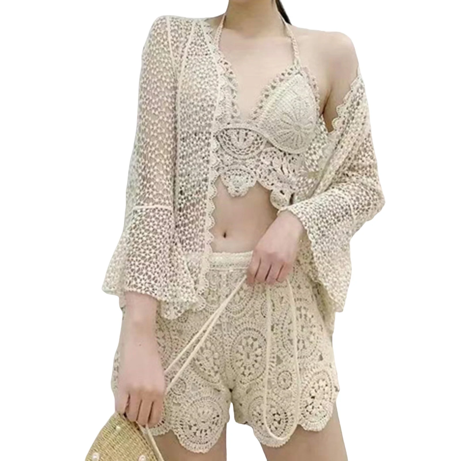 Knitted Swimwear Outfit Solid Color Boho Embroidered Lace-Up Vests for Girl Woman Mother Lover