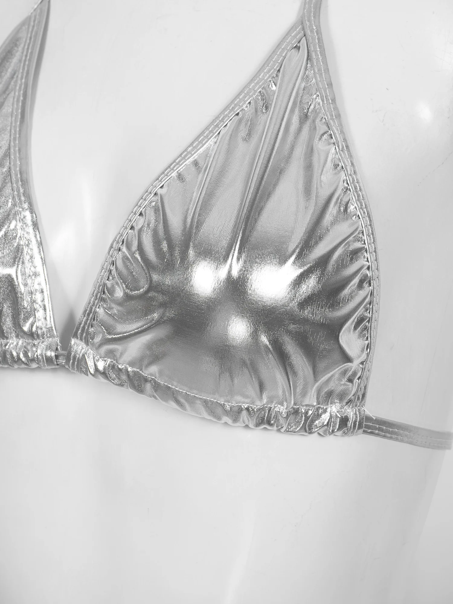Women Metallic Swimsuit Shiny Tankini Halter Bra Tops + G-String Briefs with O-Ring Bathing Suit Swimming Pool Party Bikini Set