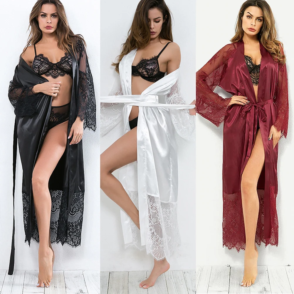 Women's Sexy Lace Robe Sleepwear Nightdress Silk Lace-Up Floral See-through Long Maxi Skirt Underwear Cover-Up Dress
