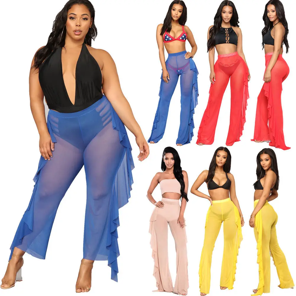 Summer Women Beach Mesh Sheer Bikini Cover Up Plus Size Ruffles Swim pants Swimwear Bathing Suit Pant Trousers