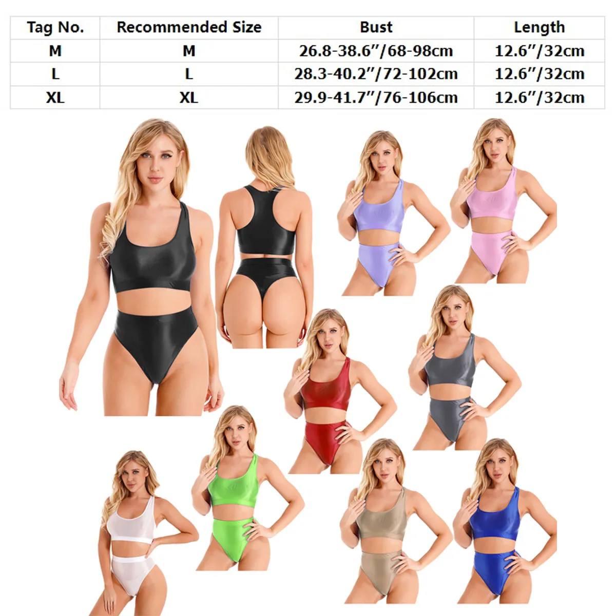 Womens Swimsuit Swimwear Outfit Oil Glossy Tight U Neck Sleeveless Crop Tank Top High Waist Briefs Yoga Workout Bathing Suit