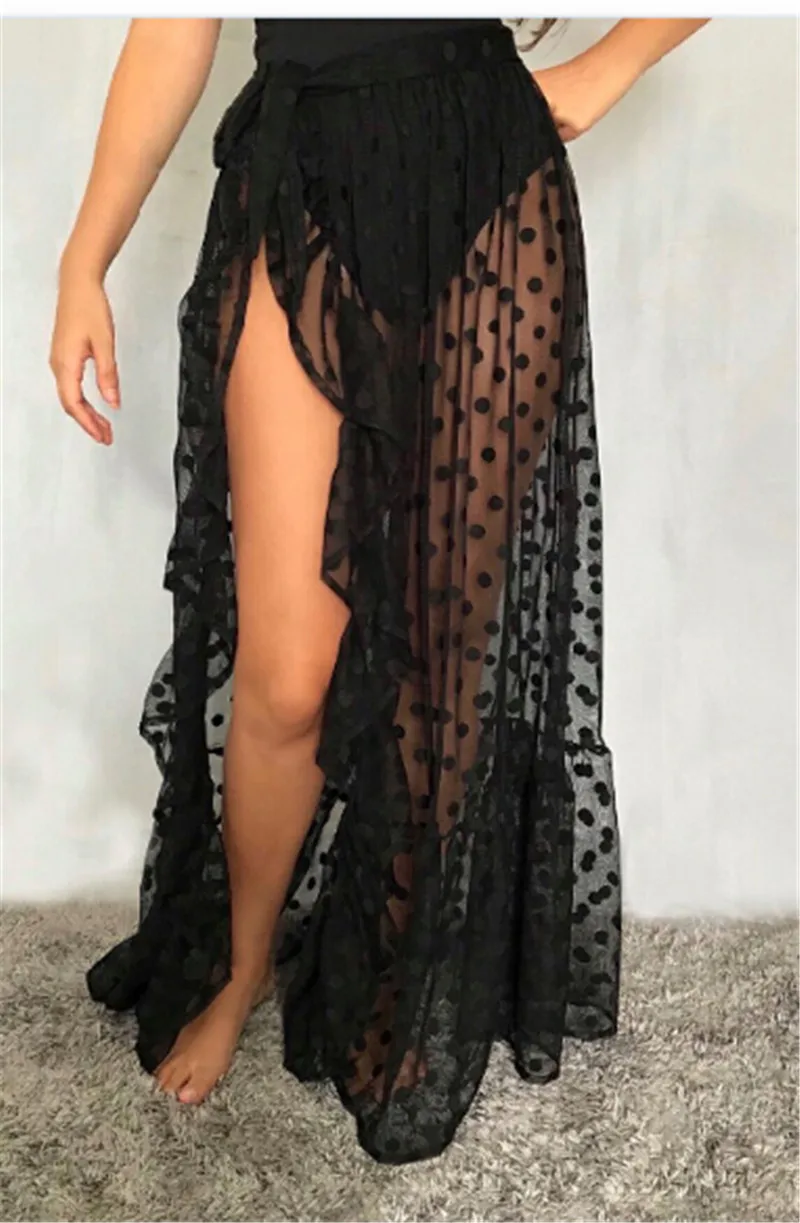 2020 New Sexy Women Mesh Sheer Beach Bikini Cover Ups Vacation Sunscreen Wrap Skirt RufflesDot High Waist Split Beachwear