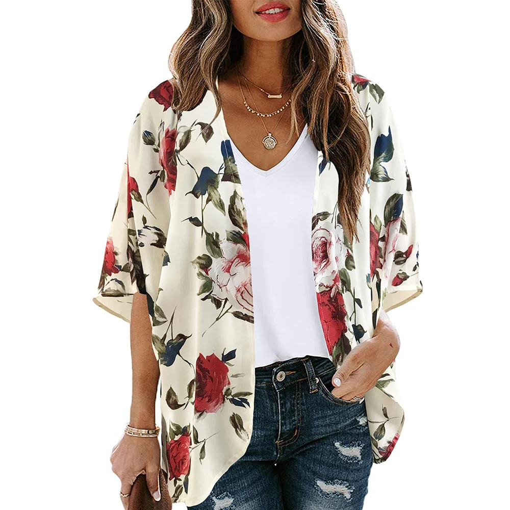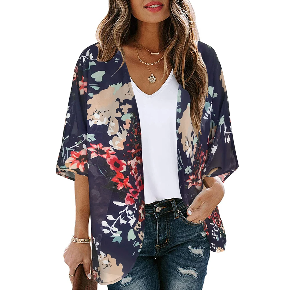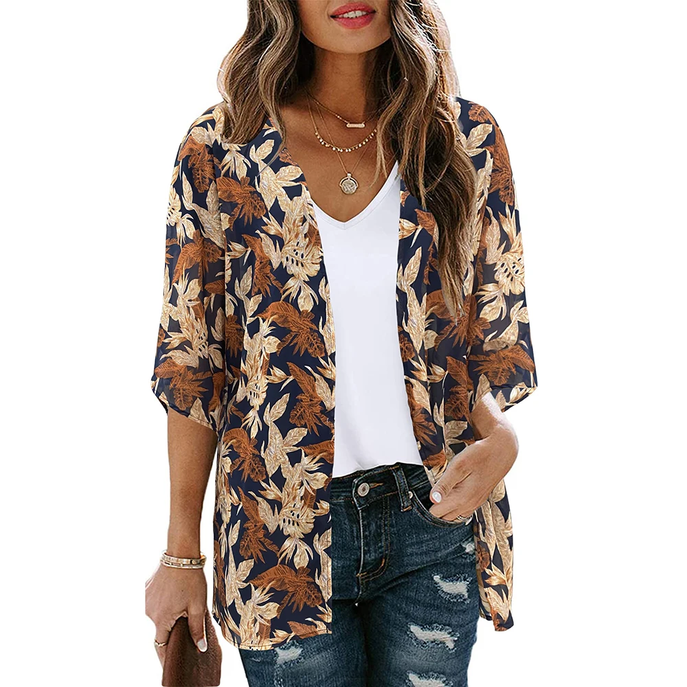 Summer Women's Cover Ups Colorful Striped Printed Casual Chiffon Cardigan Tops Three-Quarter Sleeve Top Summer Open Front Tops