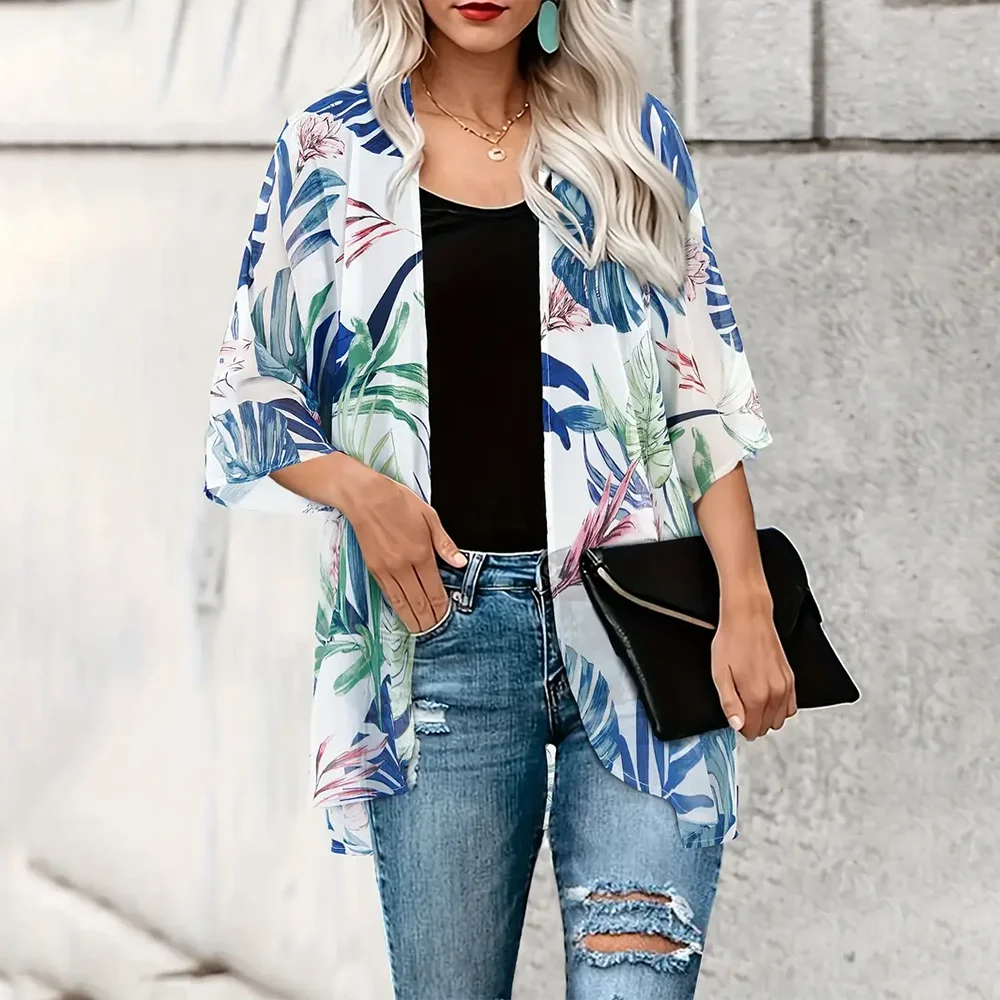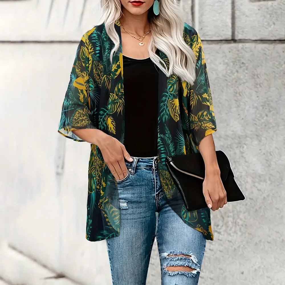 Women's Fashionable Maple Leaf Printed Chiffon Cardigan Shirt Elegant Beach Cover Up Top Loose Summer Breathable Jacket Clothing