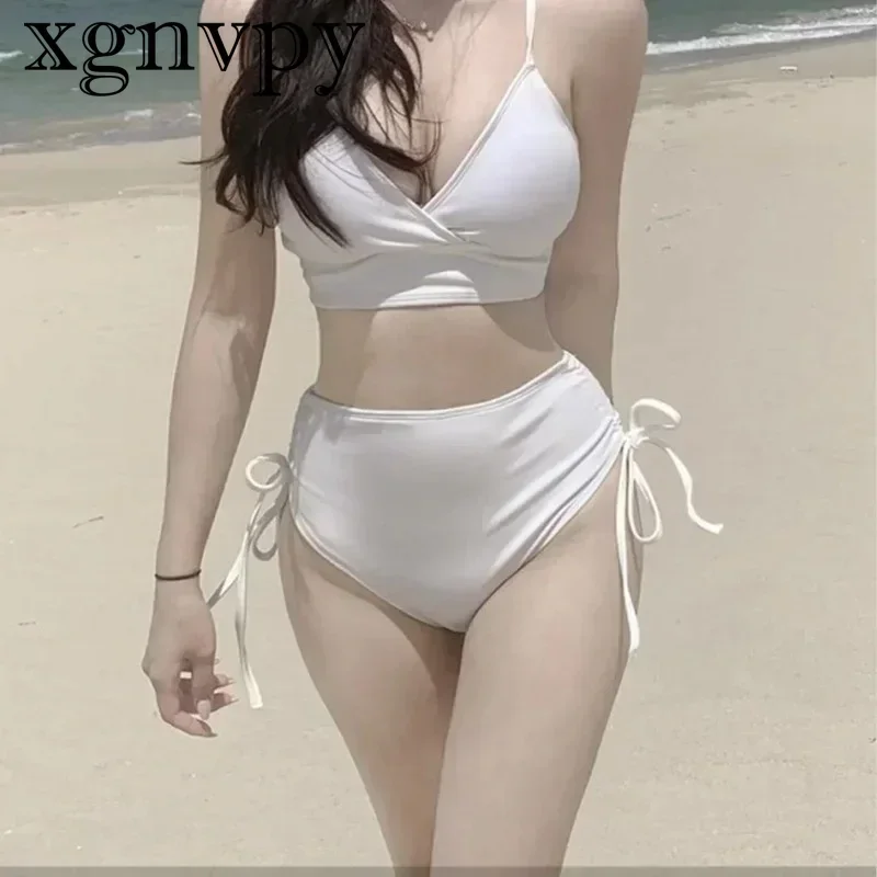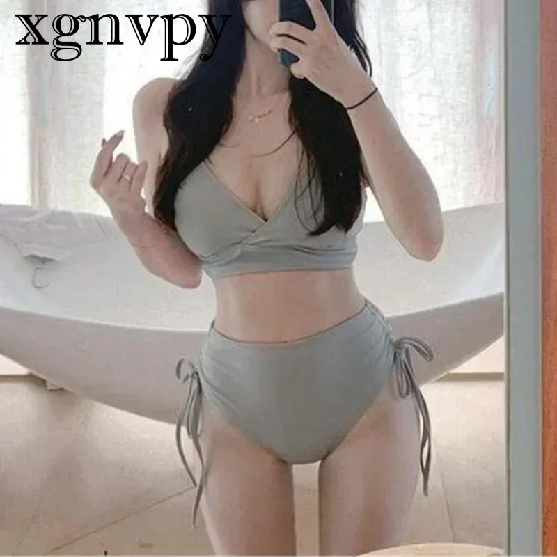 Name | xgnvpy New Korean two-piece swimsuit women's solid color tight height waist slimming pull pleated triangle bikini |