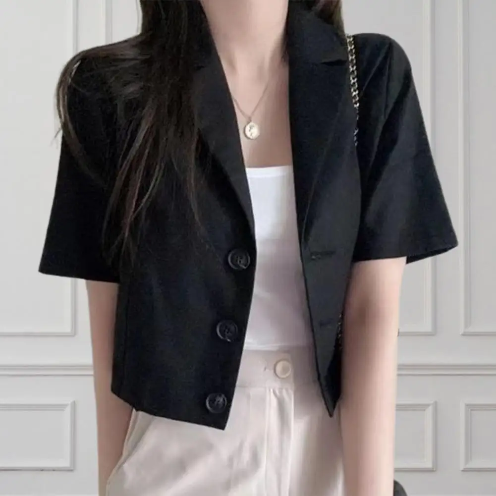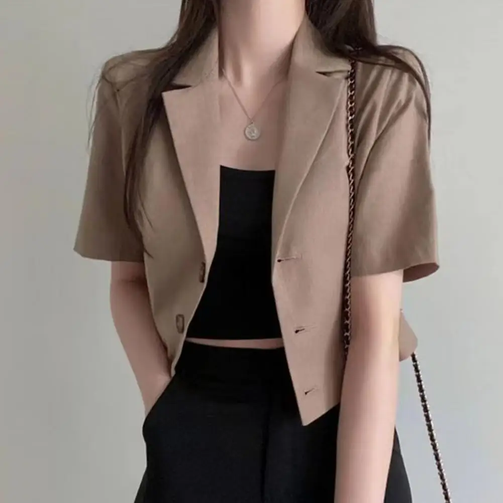 Women Summer Suit Coat Lapel Short Sleeve Single Breasted Buttons Placket Short Suit Jacket Solid Color Business Outwear