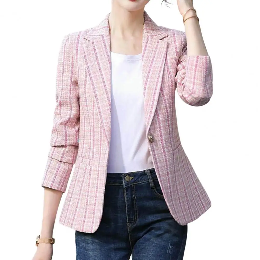 Women Blazer Plaid Print Contrast Color Turn-down Collar Cardigan Long Sleeves Warm Business Anti-wrinkle Autumn Coat for Work