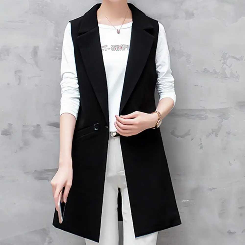 Formal Women Blazer Sleeveless Mid Length Single Button Thin Pocket Cardigan OL Style Lady Long Suit Coat