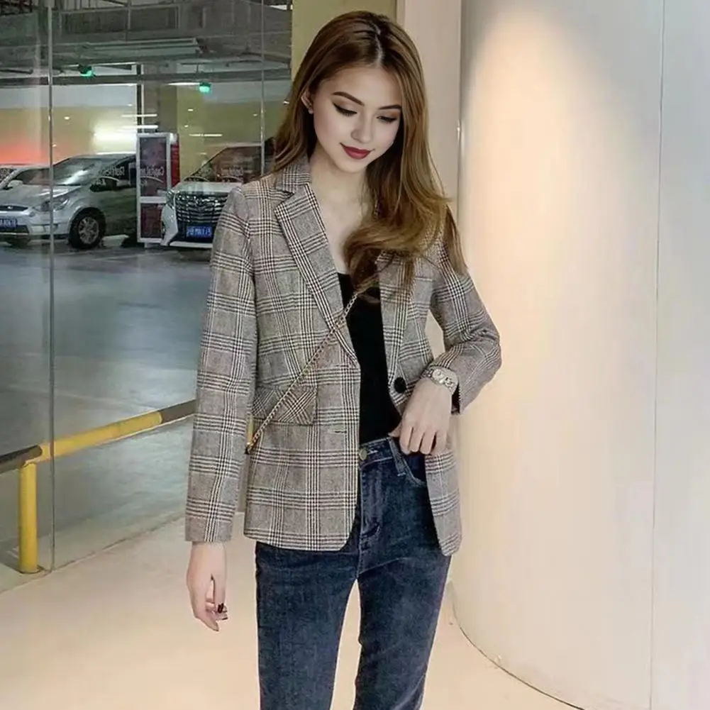 Women Suit Coat Plaid Print Lapel Suit Coat for Women Stylish Business Outwear with Flap Pockets Lightweight Jacket for Spring