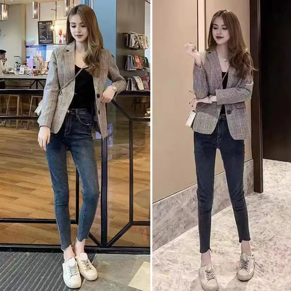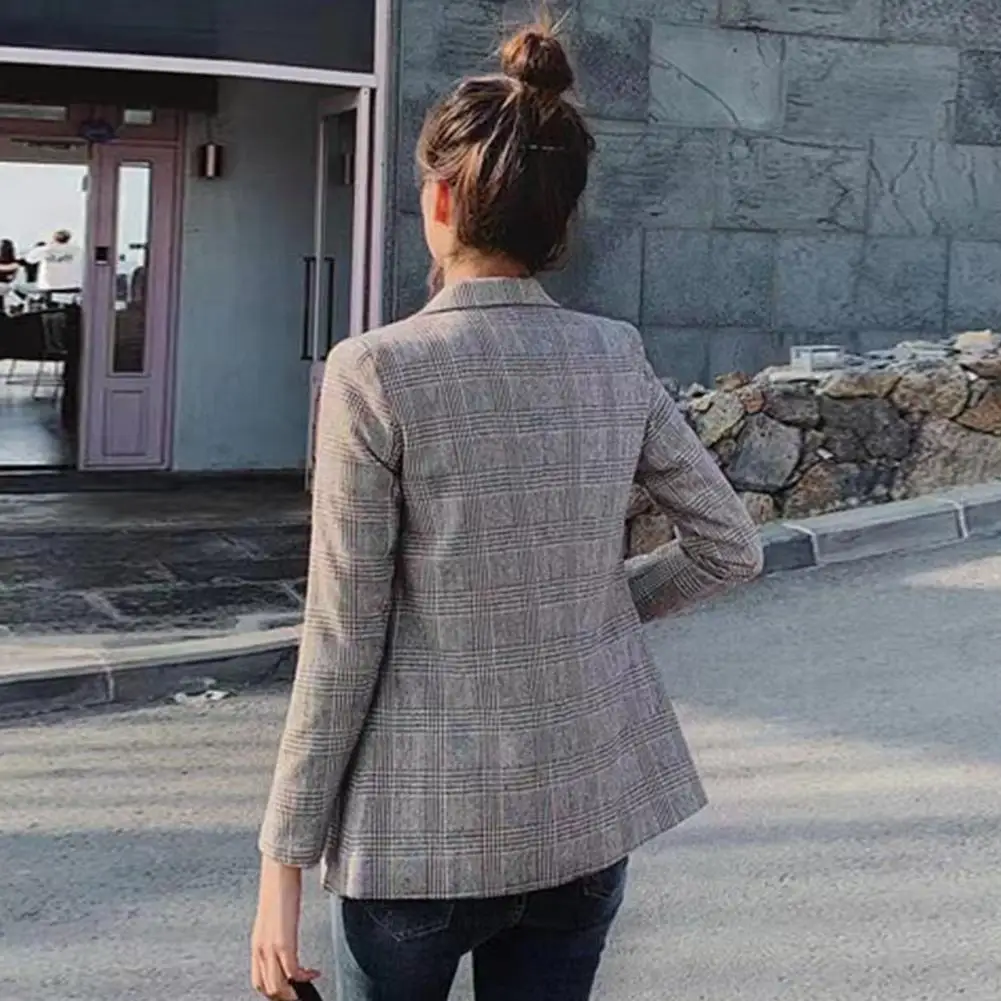 Single Breasted Suit Jacket Casual Suit Jacket Plaid Print Women's Suit Coat with Lapel Flap Pockets Stylish Business for Spring