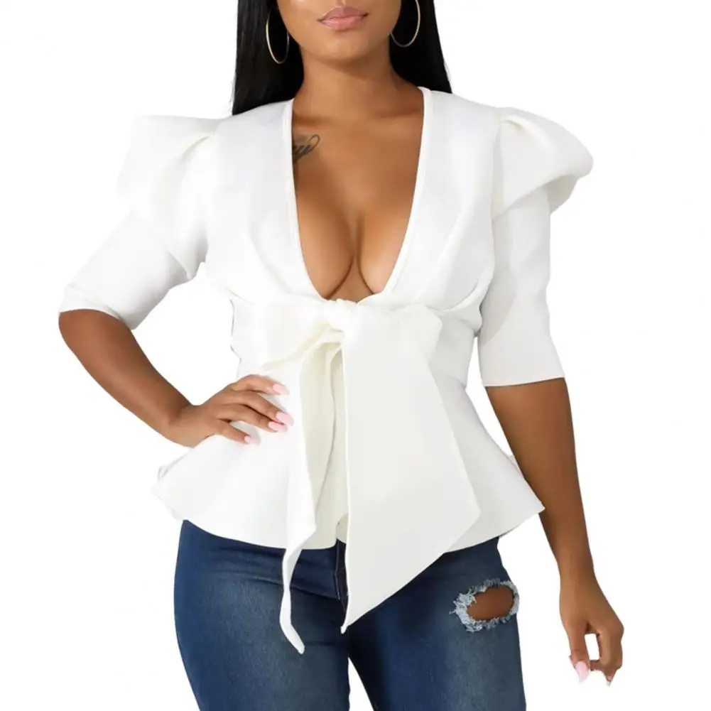Sexy Women Blazer Coat Deep V-neck Puff Half Sleeve Ruffle Hem Bowknot Bandage Peplum Blazer Workwear