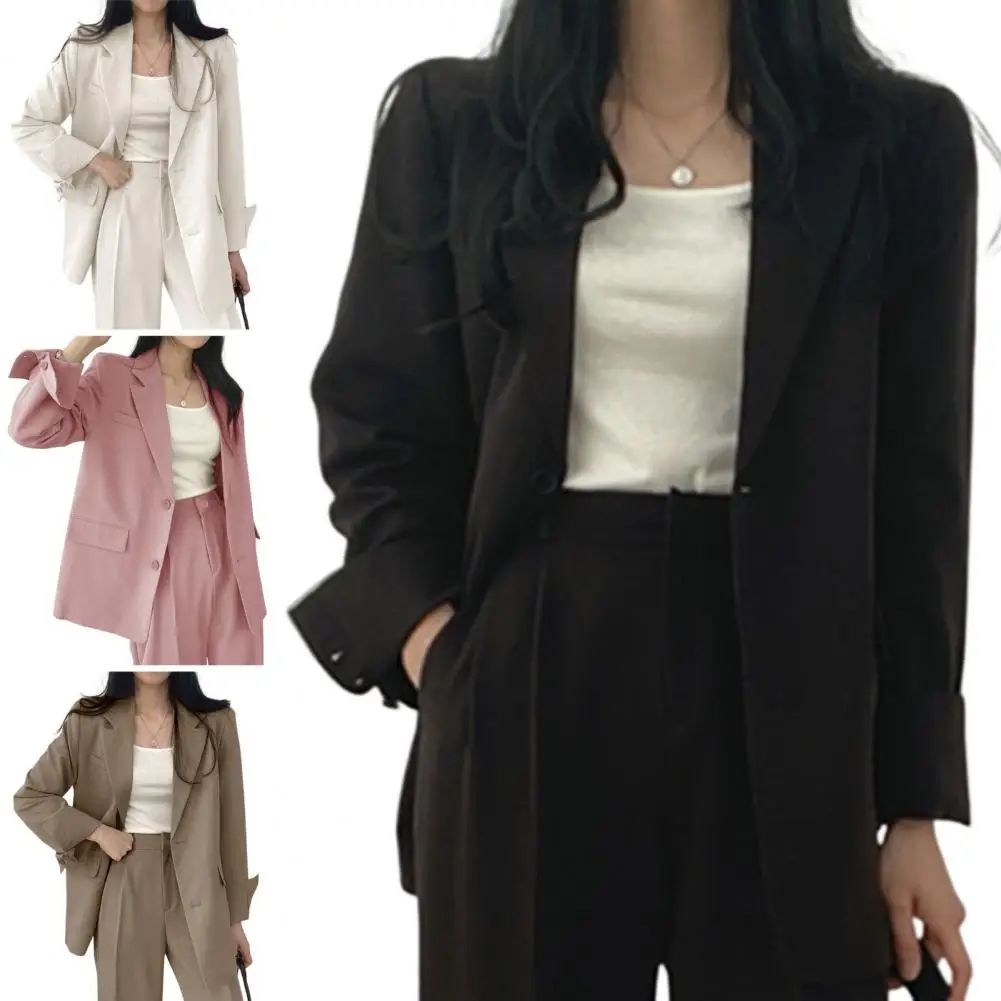 Solid Color Stylish Women's Spring Autumn Lapel with Flap Pockets Solid Color Loose Fit Casual Workwear Jacket for Office