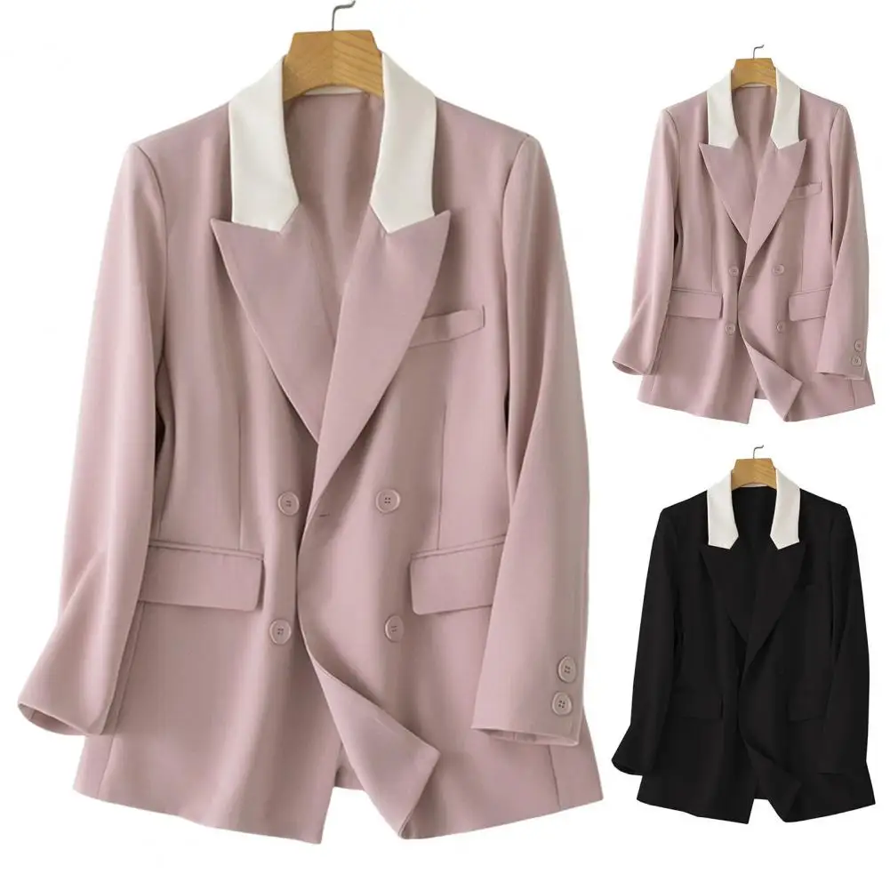 Women Casual Suit Coat Notched Lapel Long Sleeve Patchwork Color Suit Jacket Double Breasted Flap Pockets Loose Office Lady