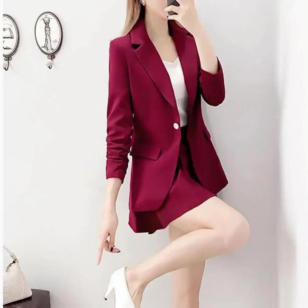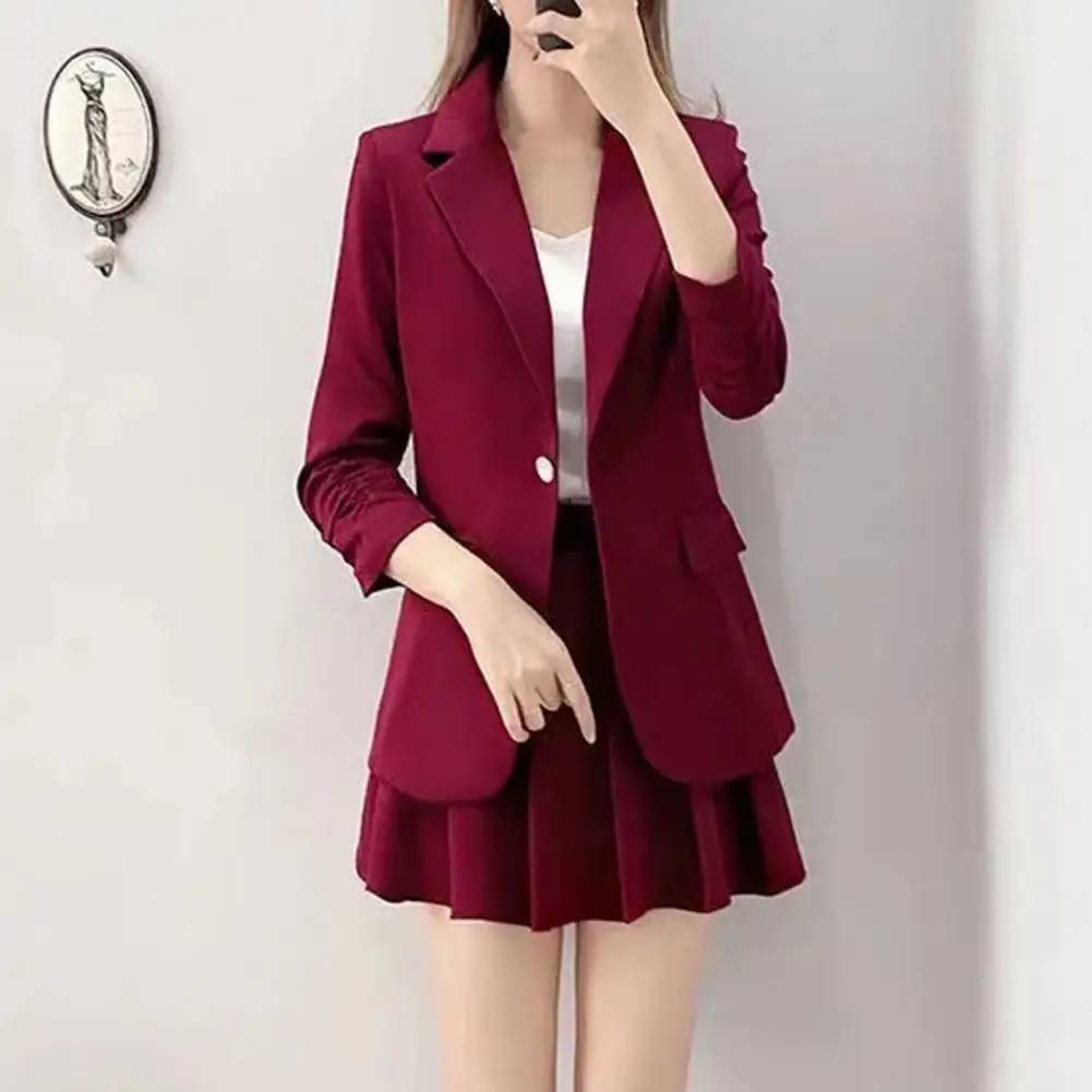 Office Wear Suit Set Women's Commuting Style Suit Set Long Sleeve Jacket Pleated Mini Skirt in Solid Color 2pcs/set Spring
