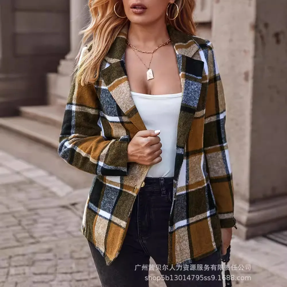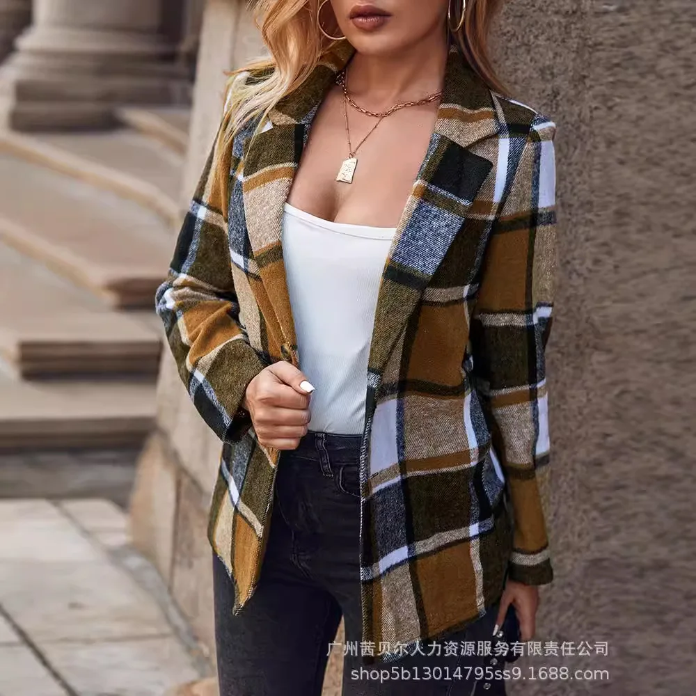 Women Autumn Winter Long Sleeve Plaid Jacket Coat Blazer Fashion Casual Office Lady