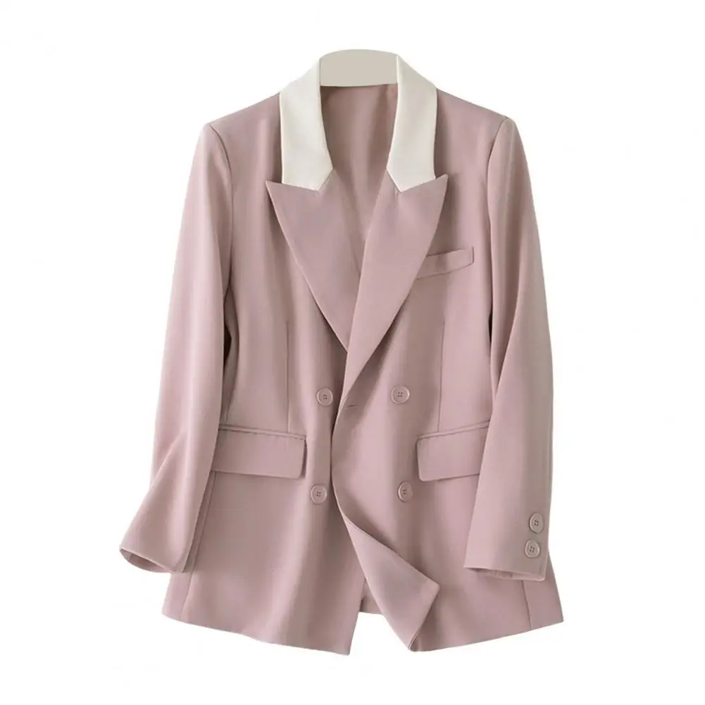 Women Blazer Suit Coat Notched Lapel Long Sleeve Patchwork Color Suit Jacket Double Breasted Flap Pockets Loose Office Outwear