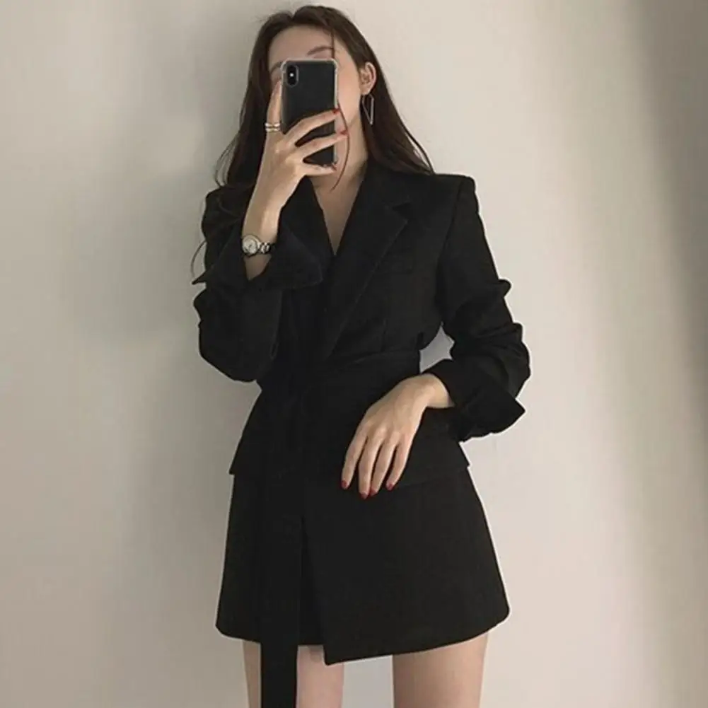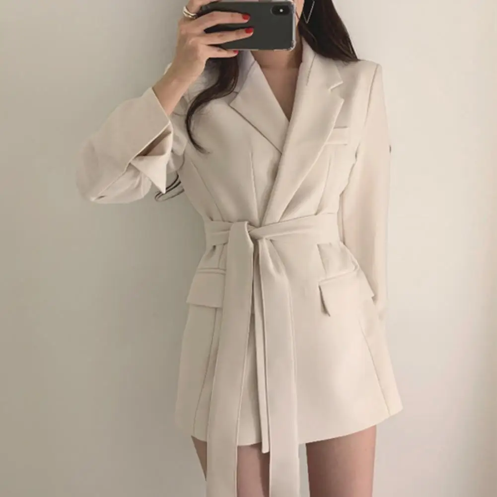 Suit Coat Versatile Mid-length Suit Coat Elegant Lace-up Waist Suit Jacket for Business Outwear with Flap Pockets for Spring