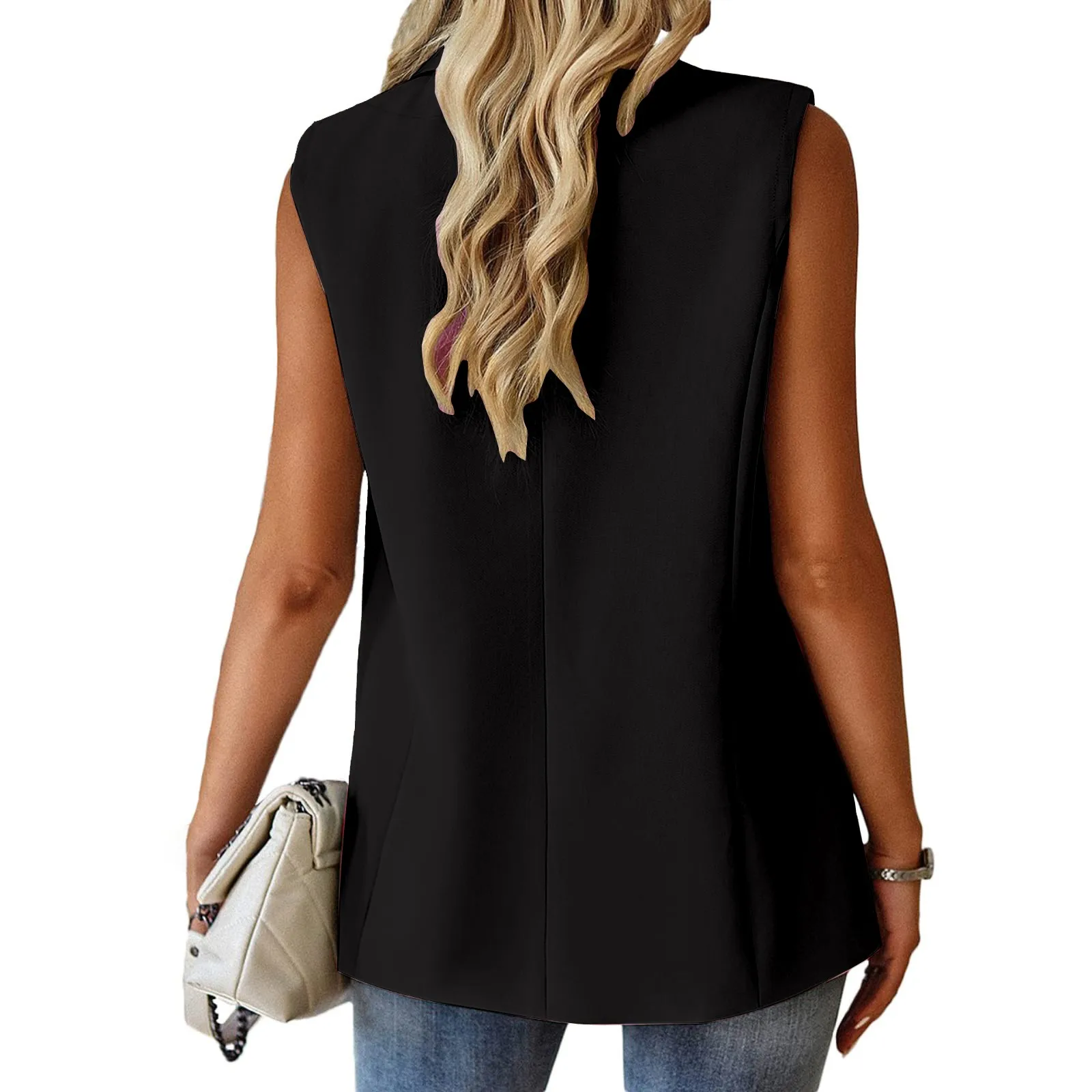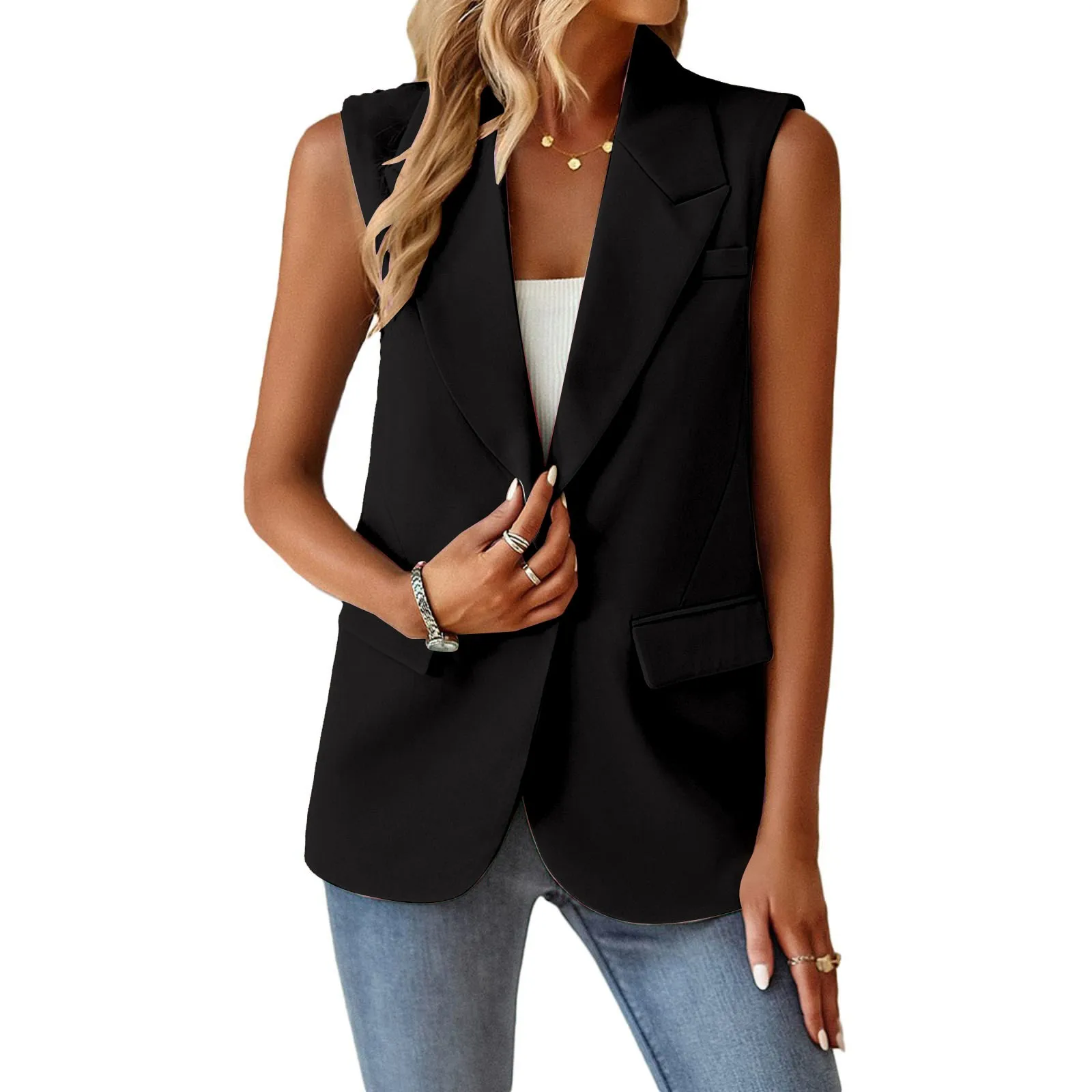 Sleeveless Blazer For Women Solid Color Single Button Suit Jacket Double Pocket Design Coat Notched Collar Blazers Feminino