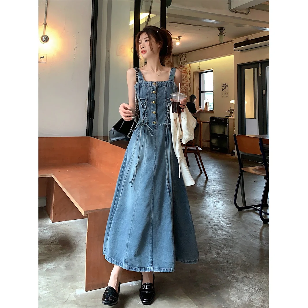 Women Demin Dress Set Fashion Y2K Spaghetti Strap Mini Dress + Full Sleeve Crop Top Streetwear Drawstring Skirts Two Piece Suits
