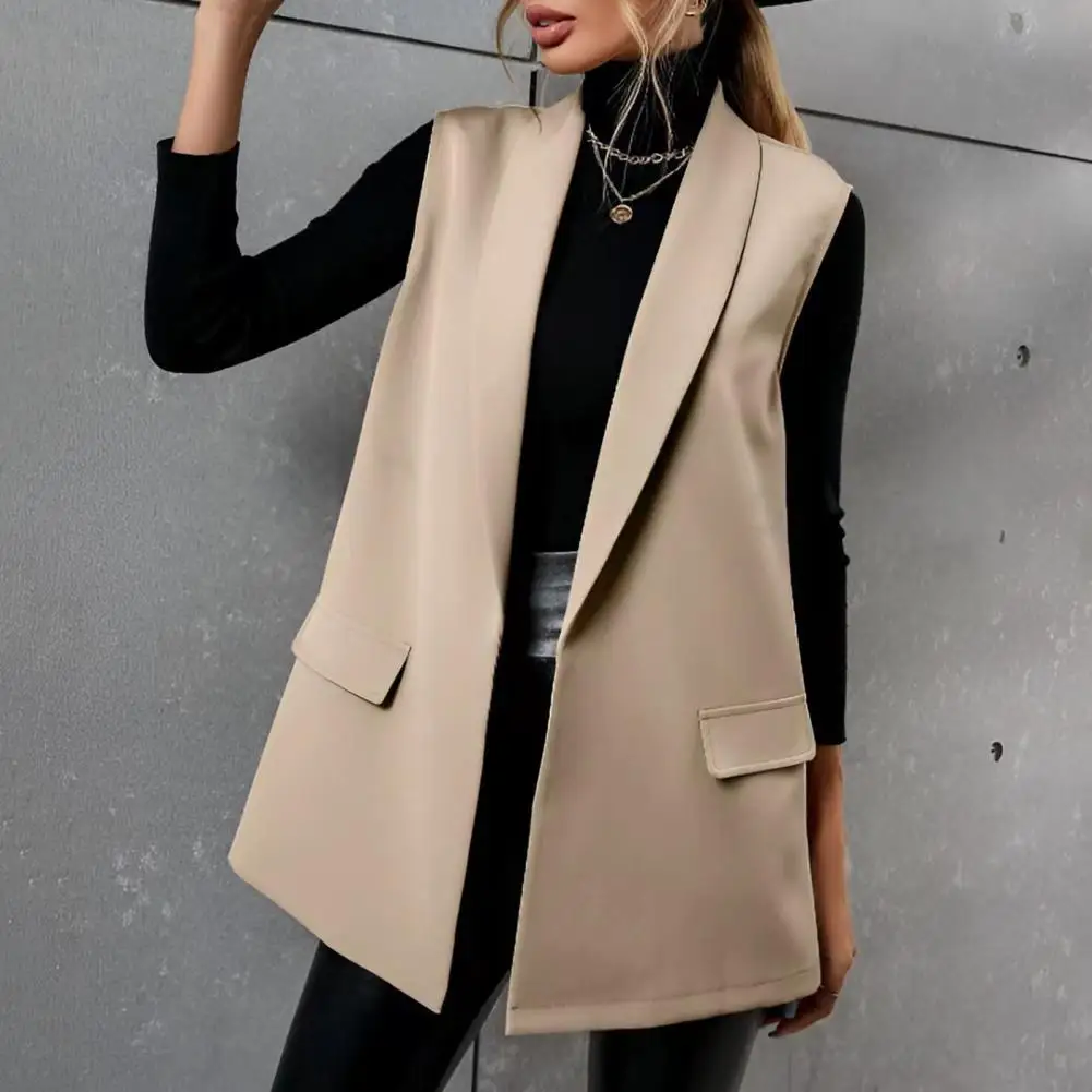 Mid-length Suit Vest Elegant Lapel Sleeveless Women's Suit Vest with Flap Pockets Mid-length Solid Color Business Waistcoat Open