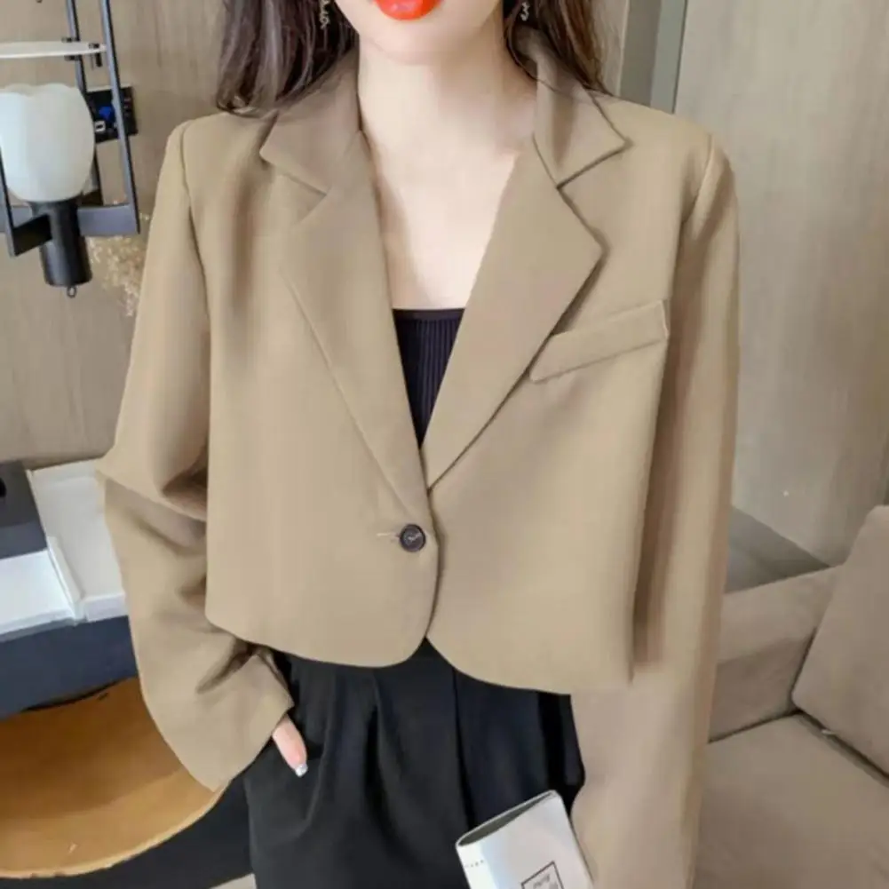 Long Sleeves Decorative Pocket Solid Color Women Blazer Single Button Lapel Navel Exposed Suit Jacket Outerwear Coats Manteaux