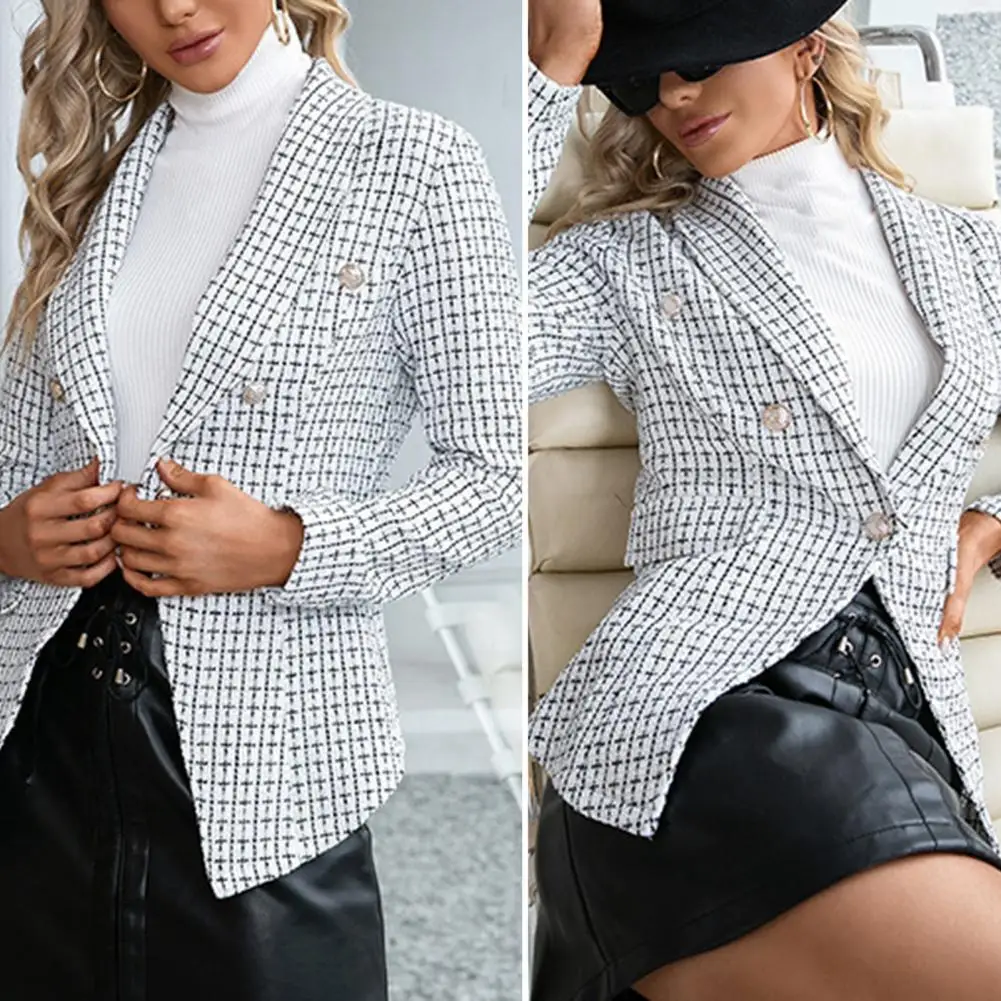 Ol Commute Suit Jacket Plaid Print Double-breasted Lapel Women's Suit Coat Stylish Thick Pockets Business Style Lady Office Suit