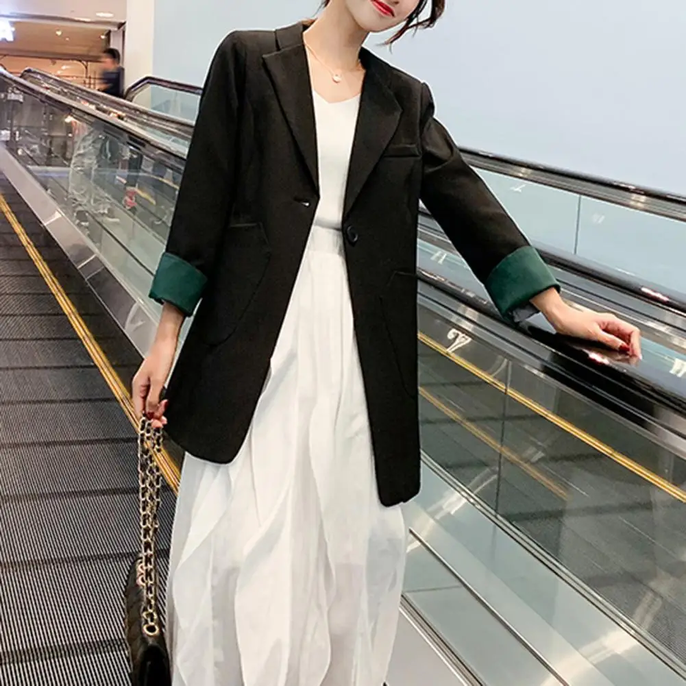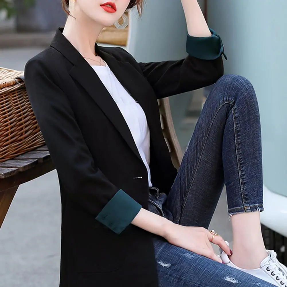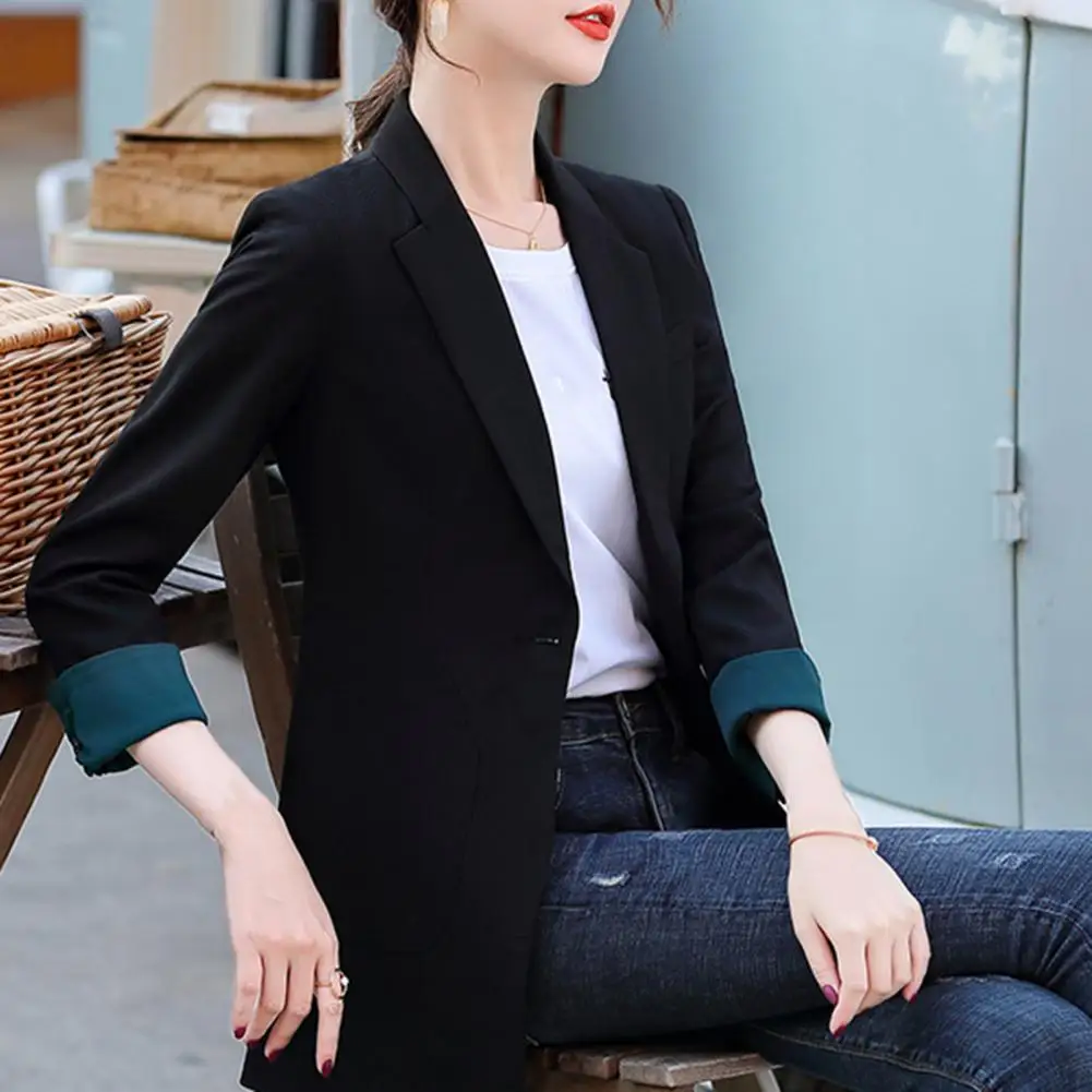 Ladies Suit Coat Solid Color Elegant Mid-length with Lapel Long Sleeves Big Pockets for Spring Autumn Suit Coat for Women