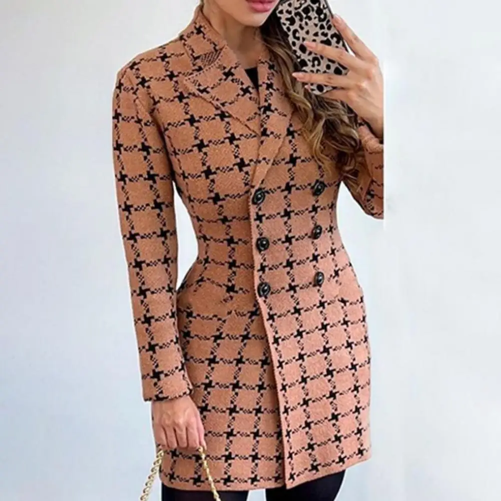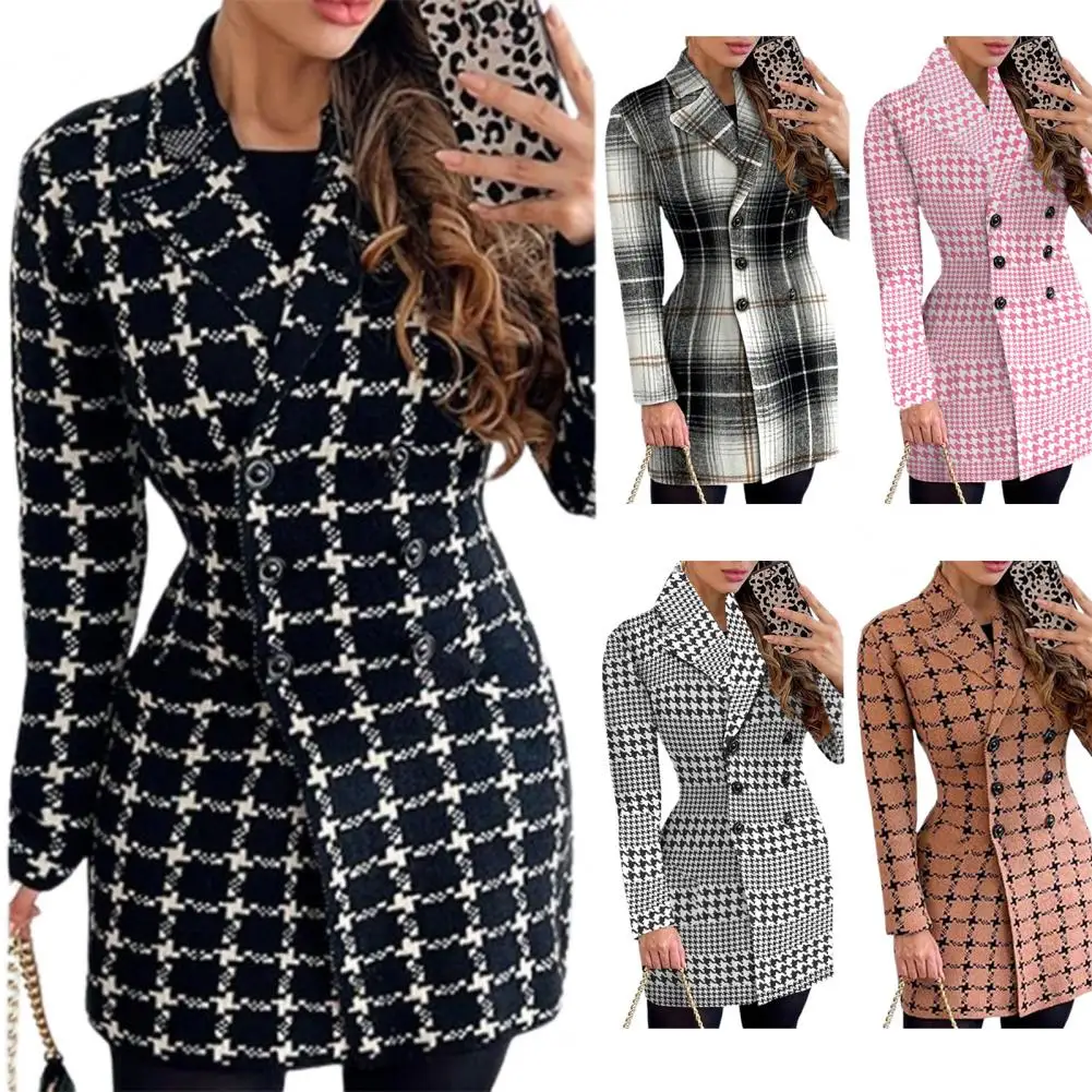 Lapel Coat Stylish Plaid Print Double-breasted Women's Suit Coat Slim Fit Long Sleeve Mid Length for Formal Business Style Long