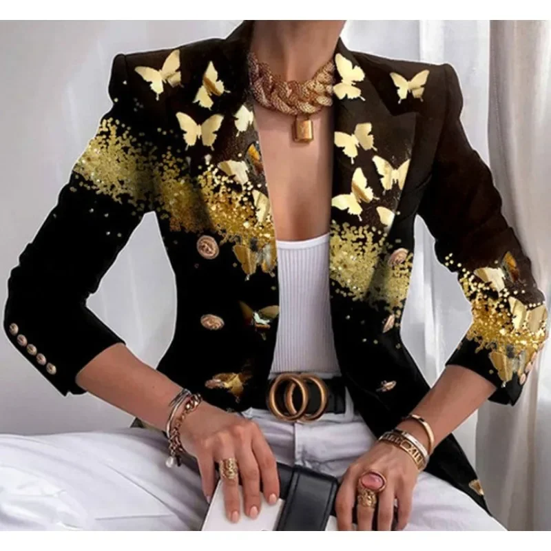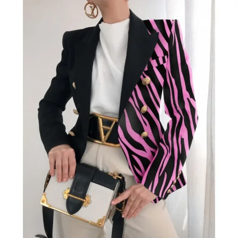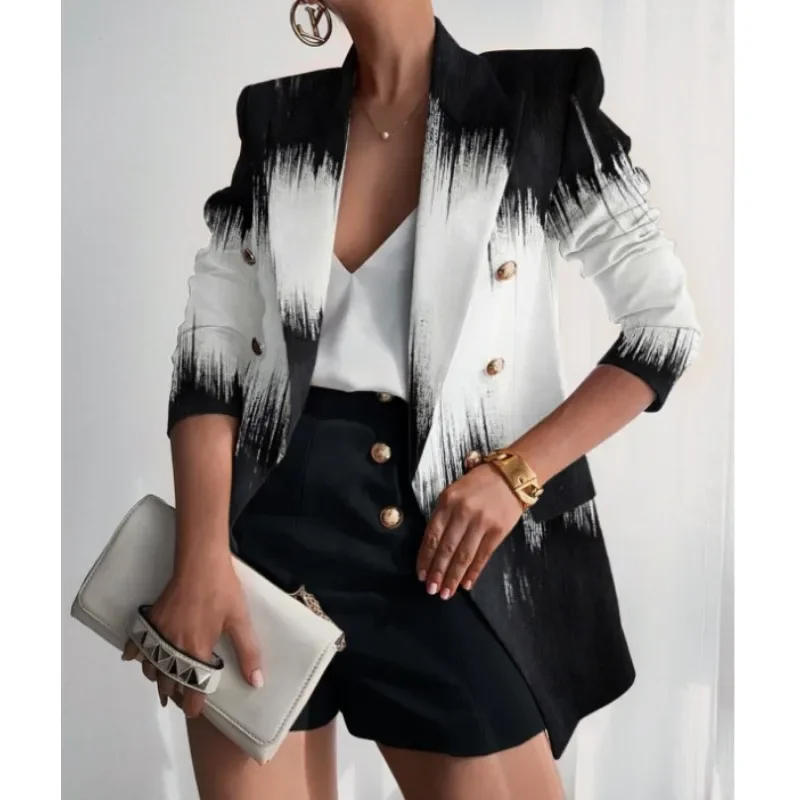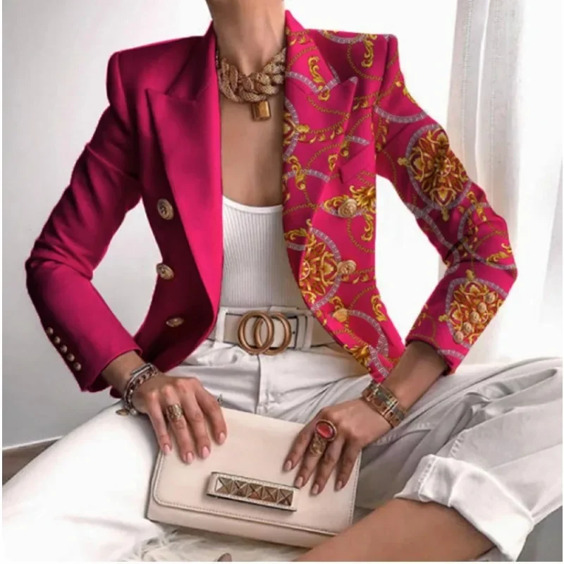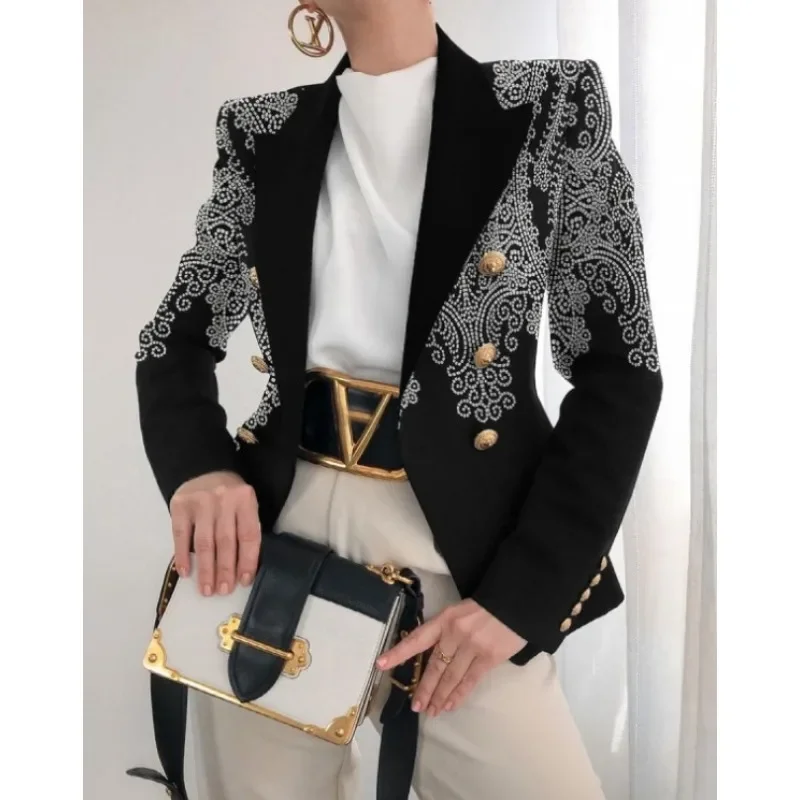 Women Fashion Casual Solid Double Breasted Long Sleeve Slim Blazer Y2K Autumn Coat Blend Outwear Jackets Chain Print Jackets