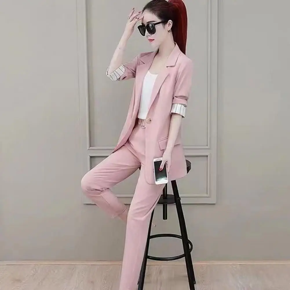 3 Pcs/Set Blazer Suit Pants Vest Set Elastic Waist OL Style Solid Color Anti-wrinkle Pockets Commute Single-button Turn-down Col