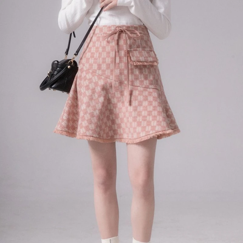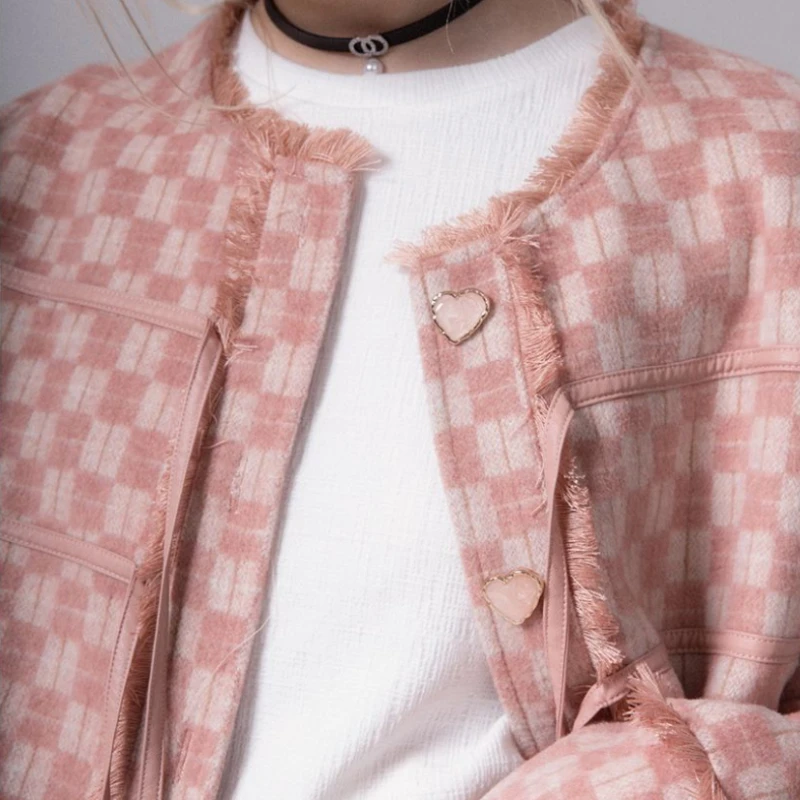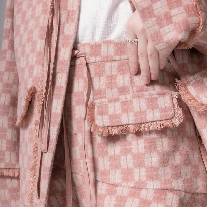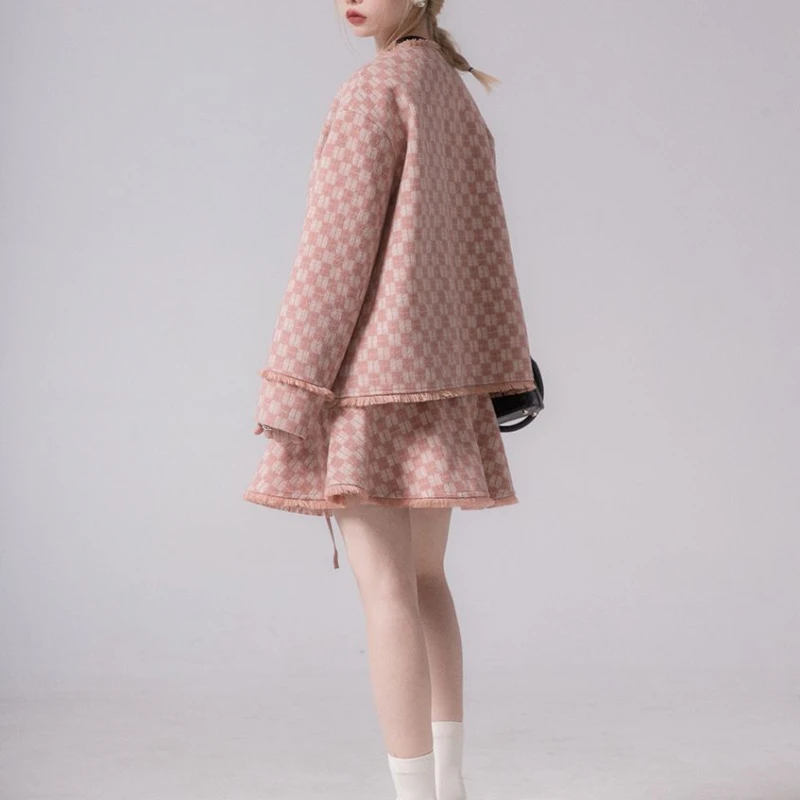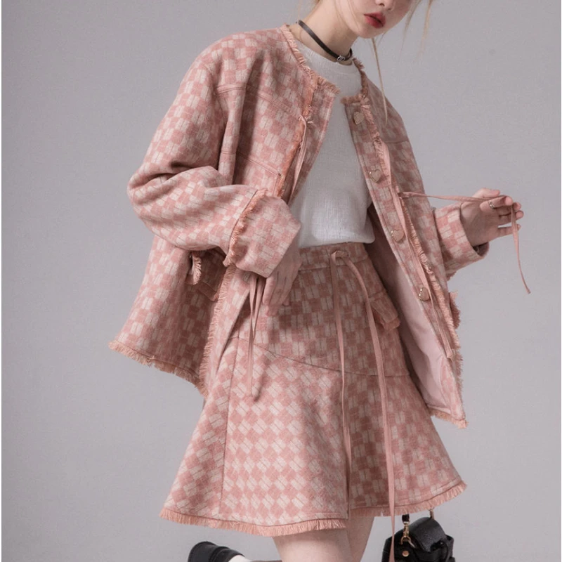 Spring Autumn High Street Loose Long Sleeve Jacket Coat with Gothic Pink High Waist Mini Plaid Skirts Two Pieces Suit for Women