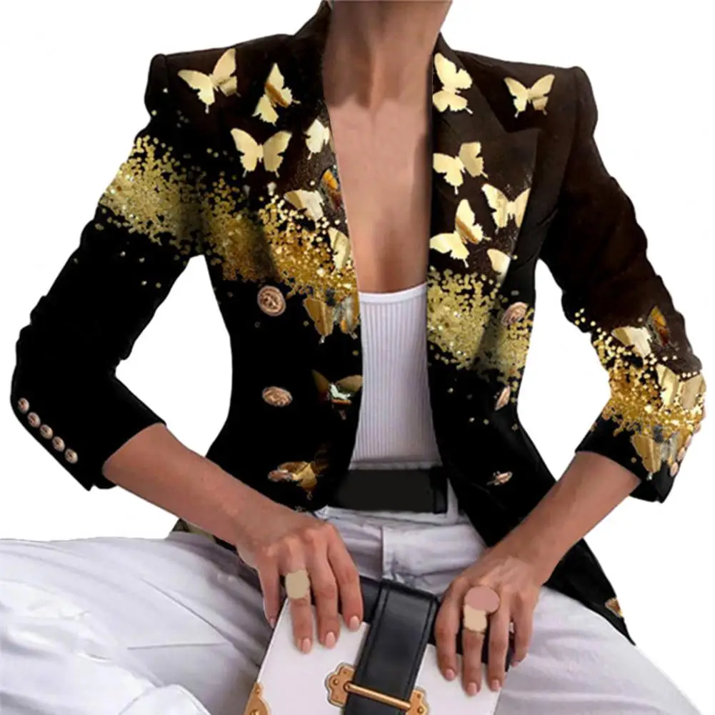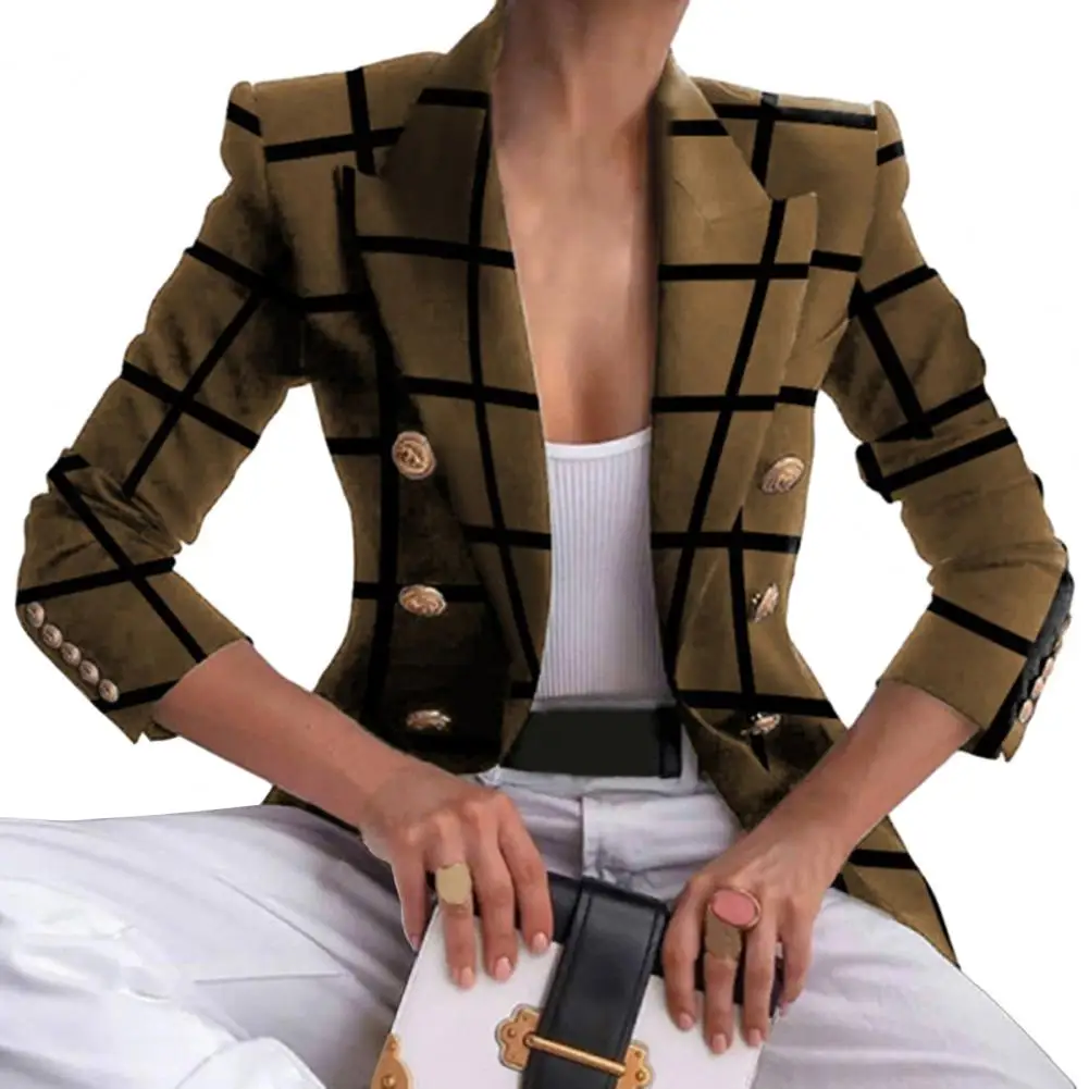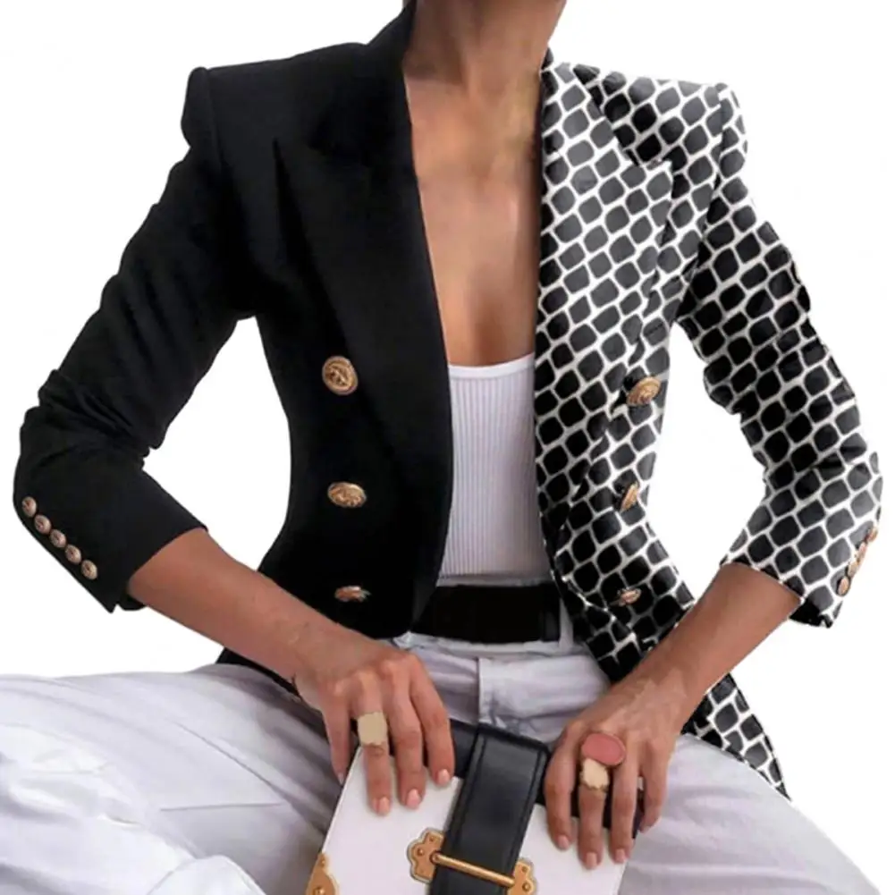 Women Blazer Autumn Winter Lapel Long Sleeve Suit Coat Color Matching Printing Double Breasted Buttons Cuffs Short Casual Jacket