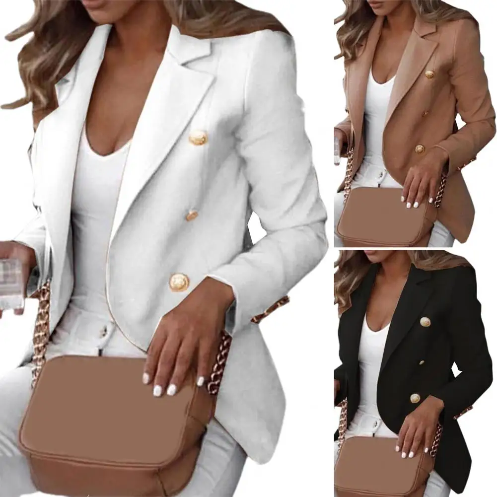 Fall Winter Suit Coat Double-breasted Solid Color Lapel Loose Cardigan Formal Business Style Pockets Long Sleeve Lady Jacket
