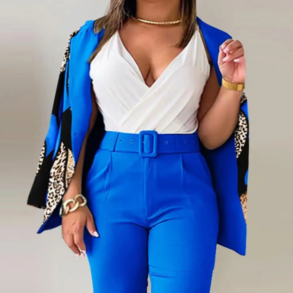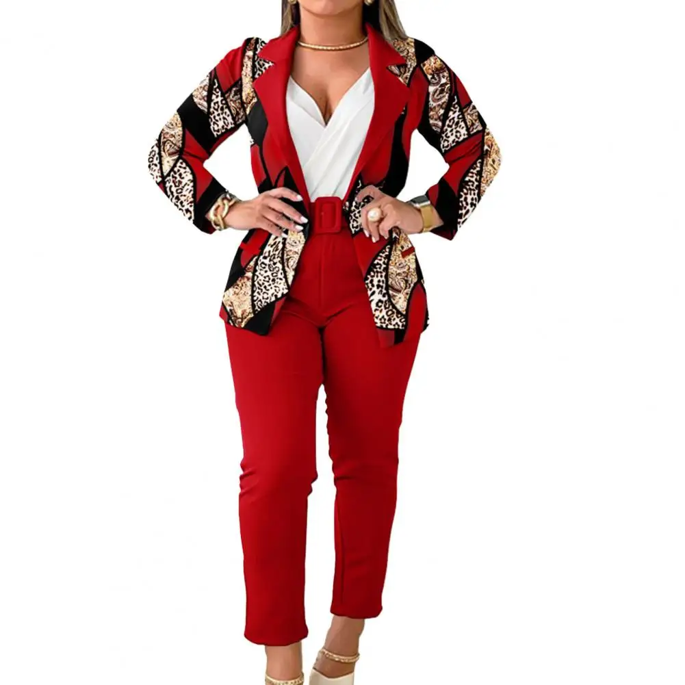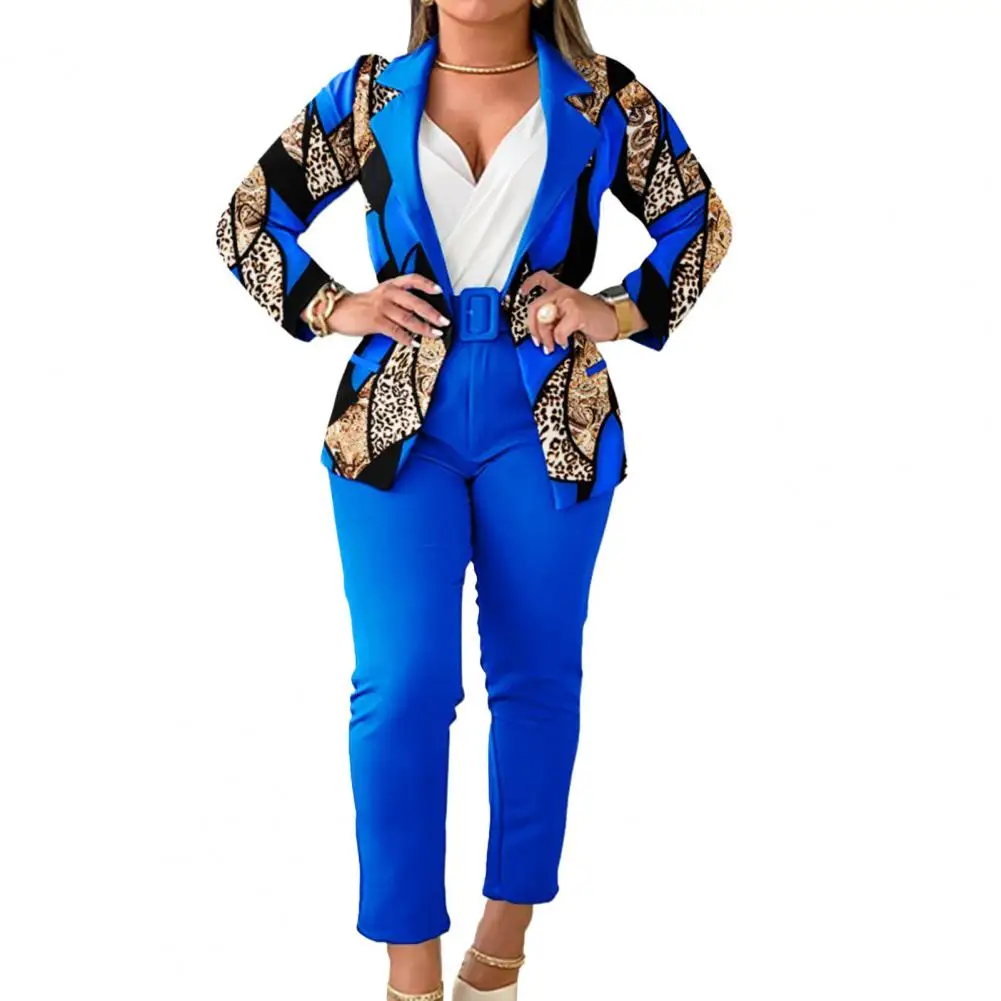 Two-piece Set Women Outfit Business Blazer Pant Suits Set Belt Printed Cardigan Elegant Office Ladies Blazer Pants Set