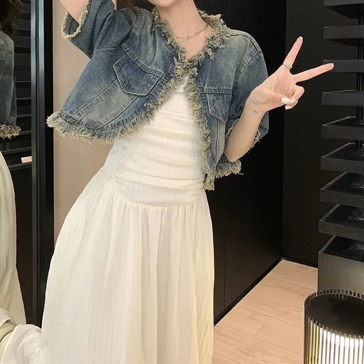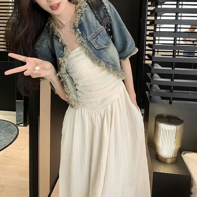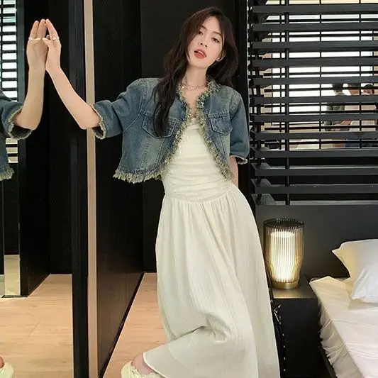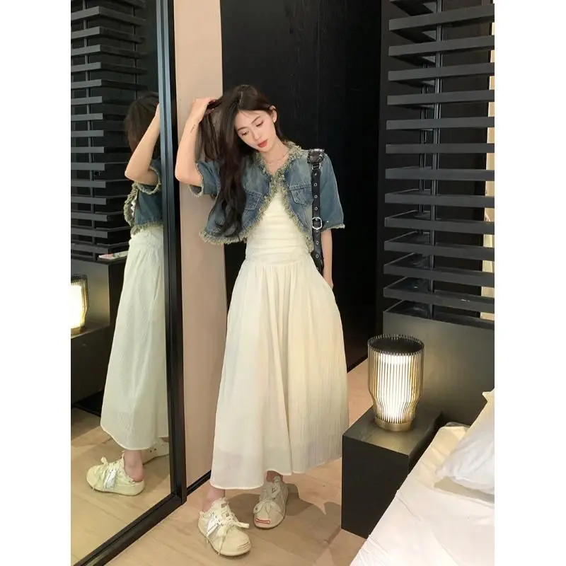 Name | Elegant Women Dress Set Korean Short Sleeve Demin Jacket Coat + Sleeveless Long Dress 2pc Set New Summer 2024 Women's Outfit |