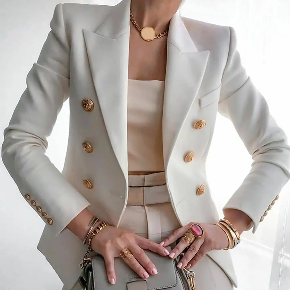 Women's autumn solid color slim-fit right-angle shoulder jacket blazer double-breasted business style blazer office OL commuter