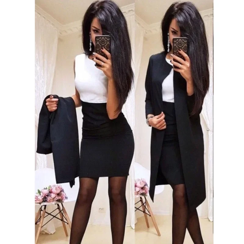 Elegant Women Two Piece Set Y2K Chic Clothes Office Lady Long Sleeve Long Coat Patchwork Bodycon Dress Suit Formal Dress