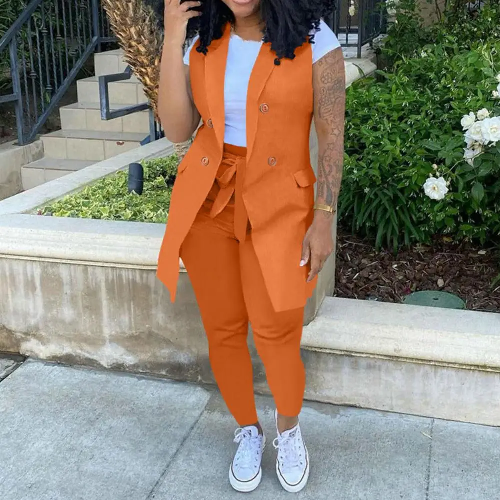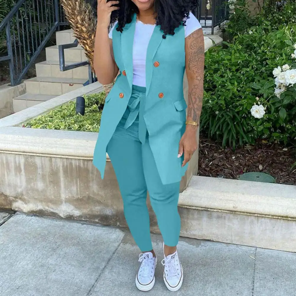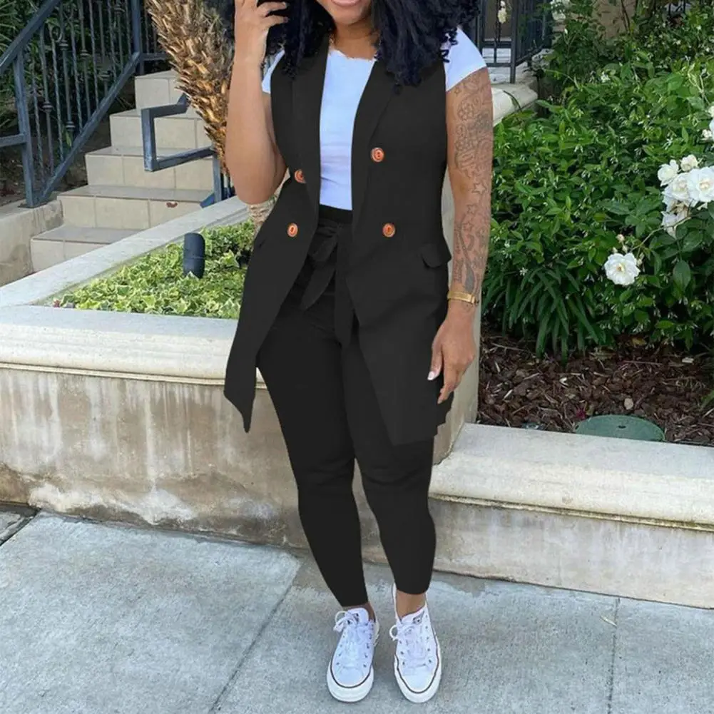 Women Waistcoat Pants Set Long Coat Sleeveless Cardigan Turn-down Collar OL High Waist Double-breasted Women Coat Trousers Suit